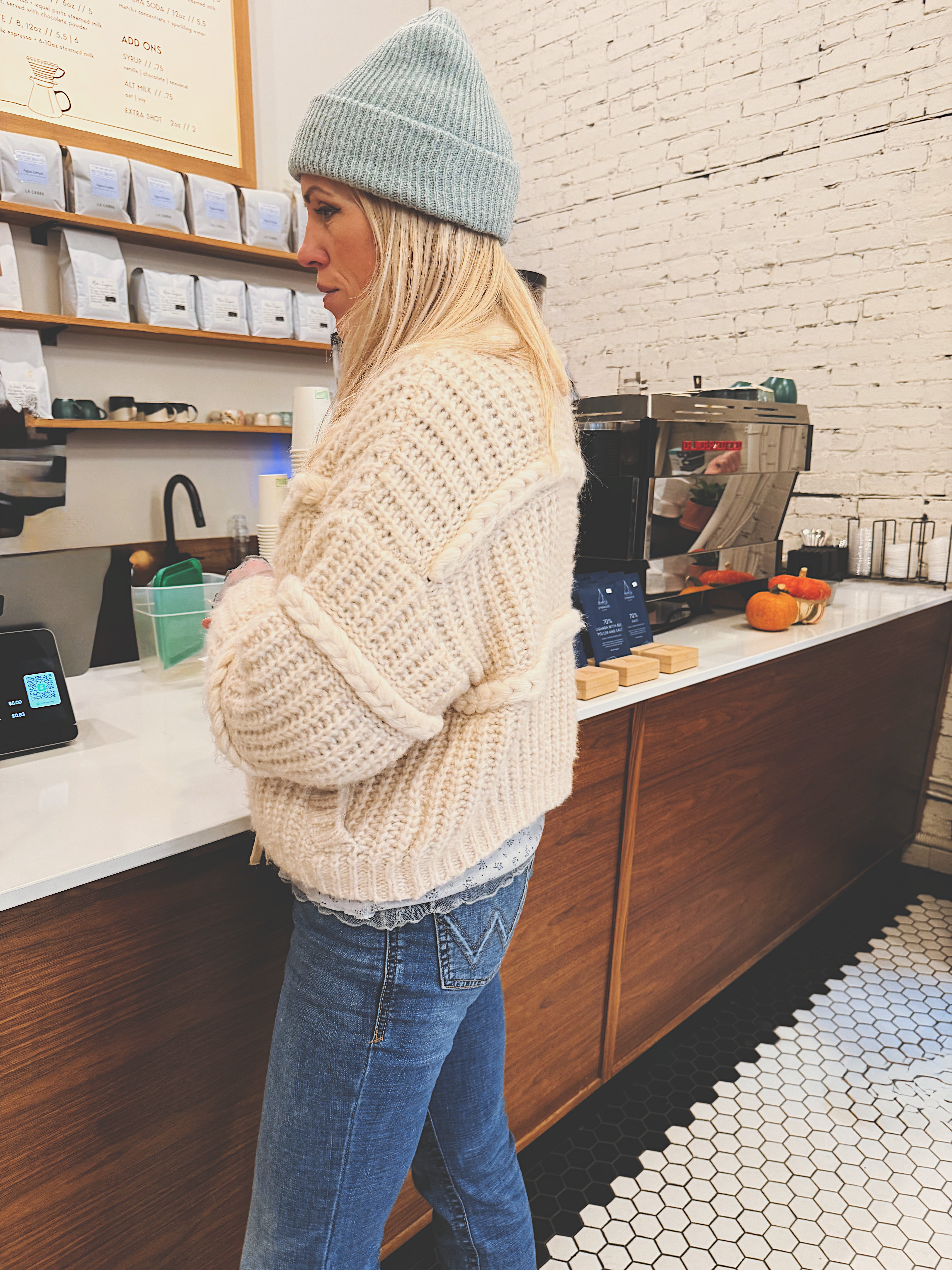 This softer than fur wool blend zip up sweater is your new winter favorite. With large braided arm details and a beautiful knit you will be adding this off white sweater to any outfit.