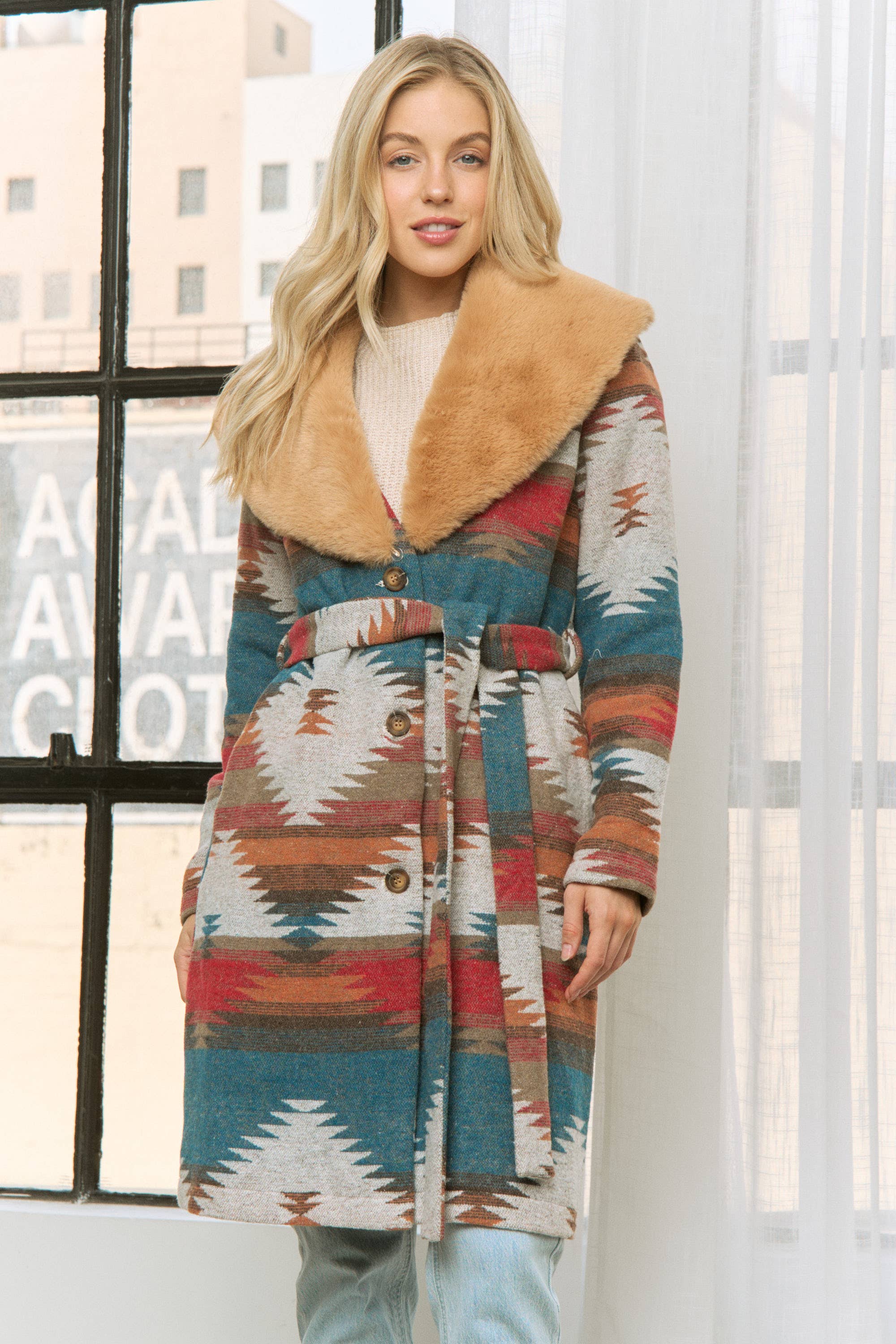 The High Desert Jacket is a mid weight Southwest print jacket with button closure and belt tie accent. Removable faux fur collar to easily transform your look.