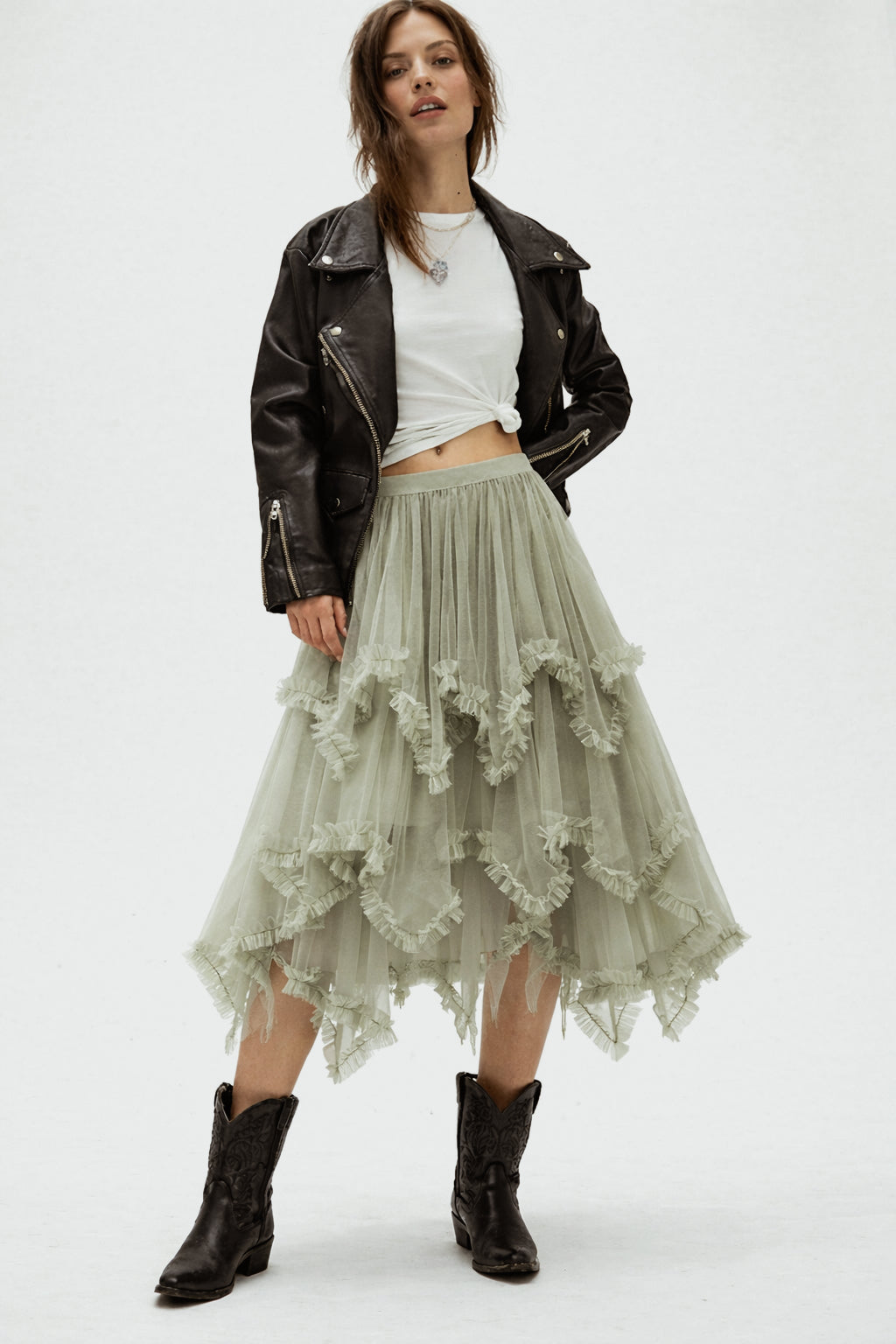 Floaty, fierce, and made for the spotlight — our Gypsy Sage Tulle Skirt brings rock-n-roll drama to a soft bohemian silhouette. Designed with layered sheer tulle and a jagged handkerchief hem, this skirt moves beautifully with every step.