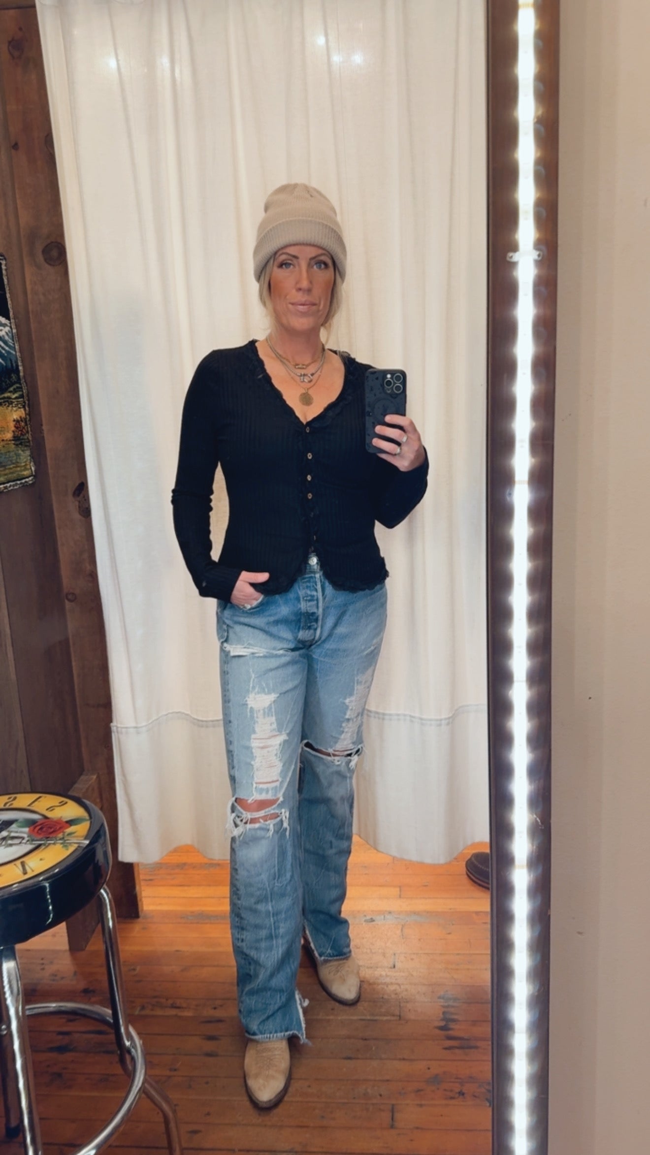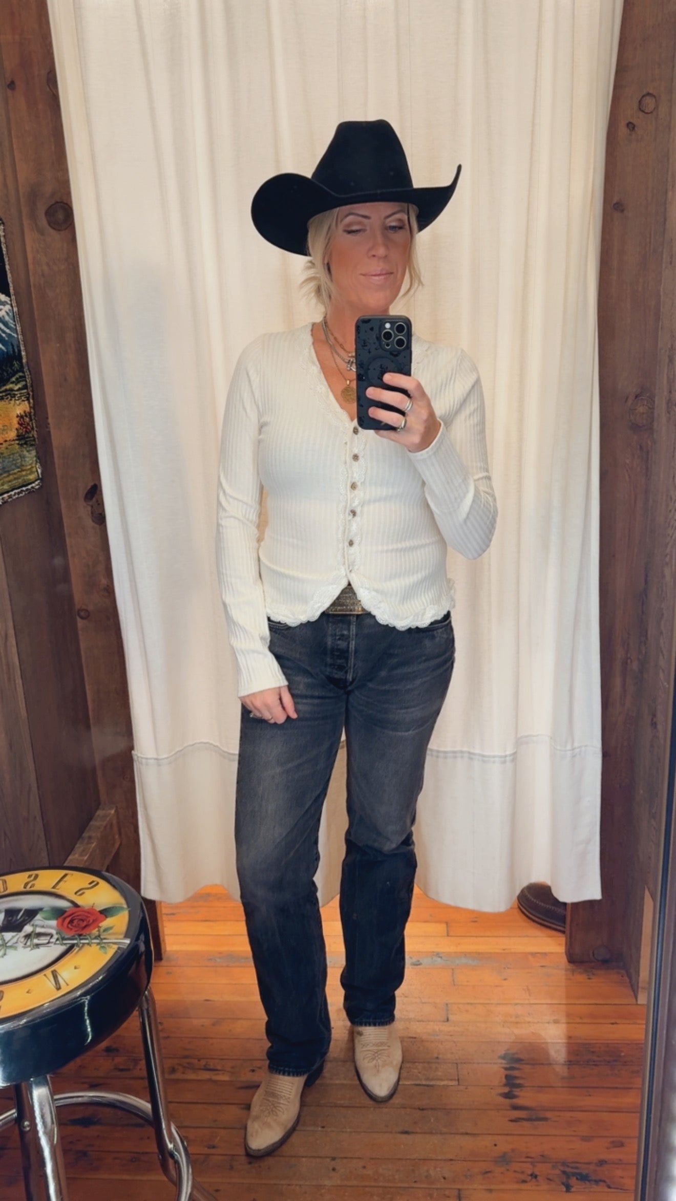 She's The One for everyday. All occasions, with a lace trim v-neck and button up front. This is an easy layering piece or a show stopper all of it's own.