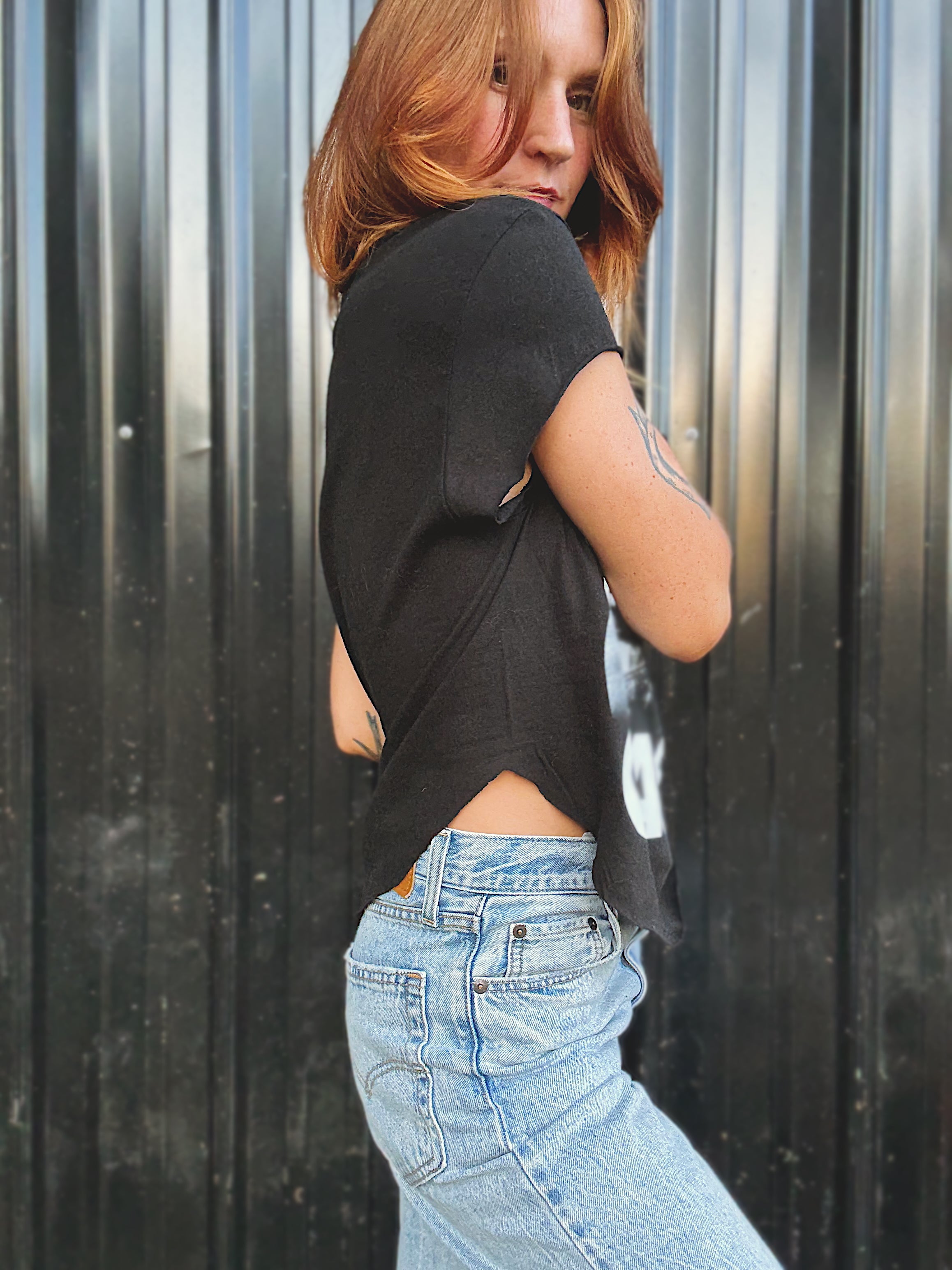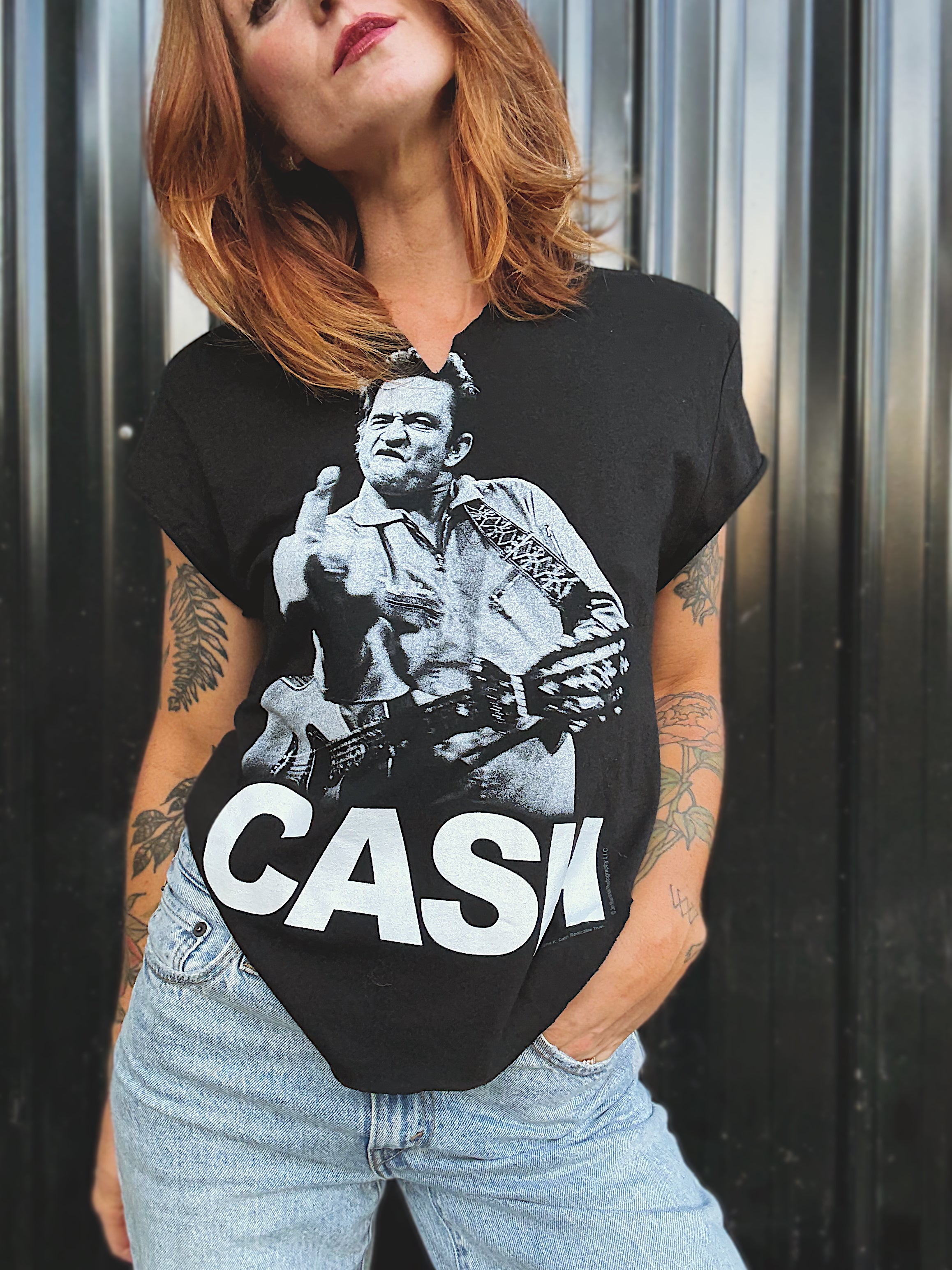 Custom Chop Shop Johnny Cash T-Shirt, with a slight v-neck, capped sleeve, and rounded body. Each Custom Chop Shop T-shirt will be unique as each is hand created.