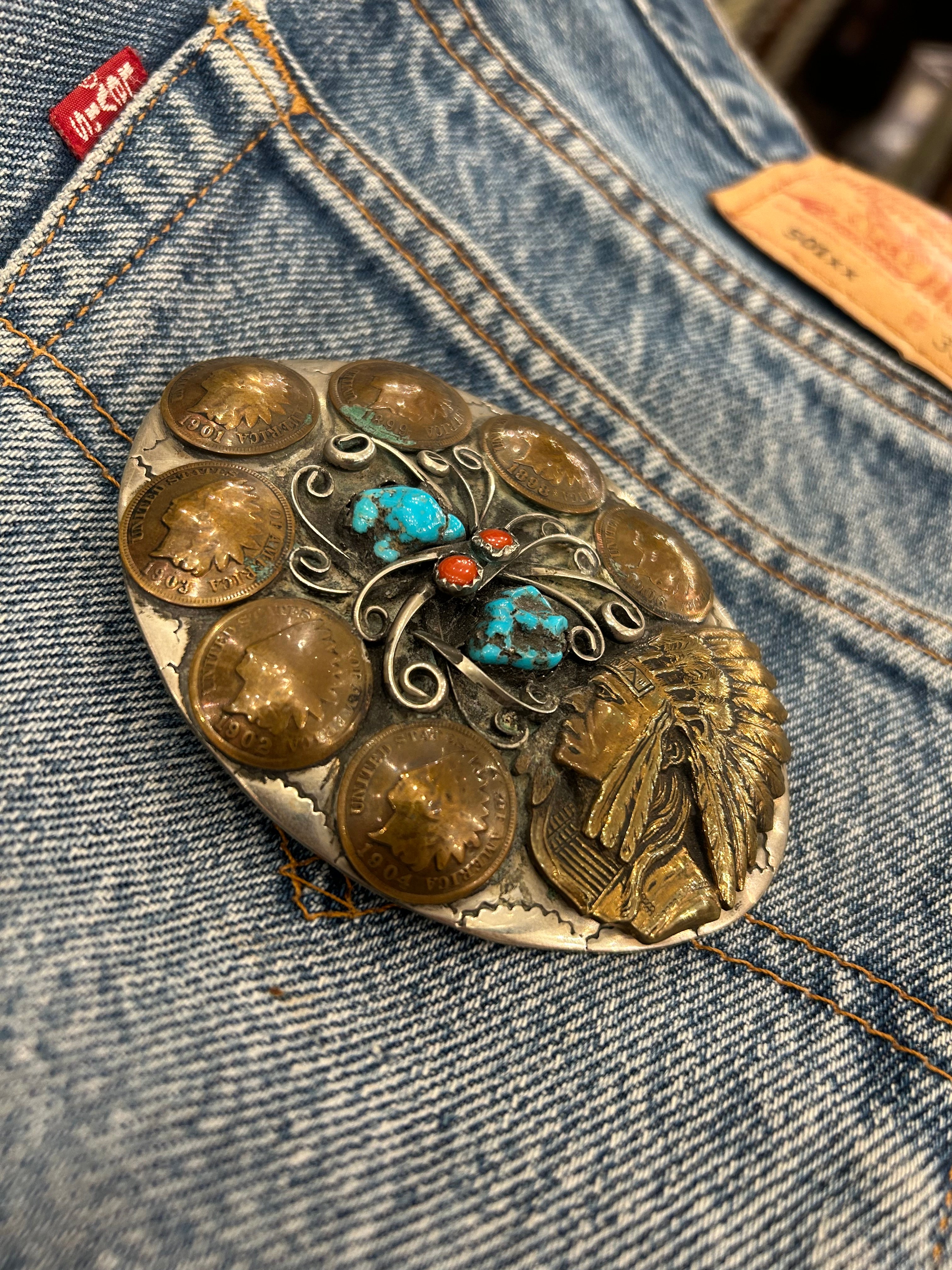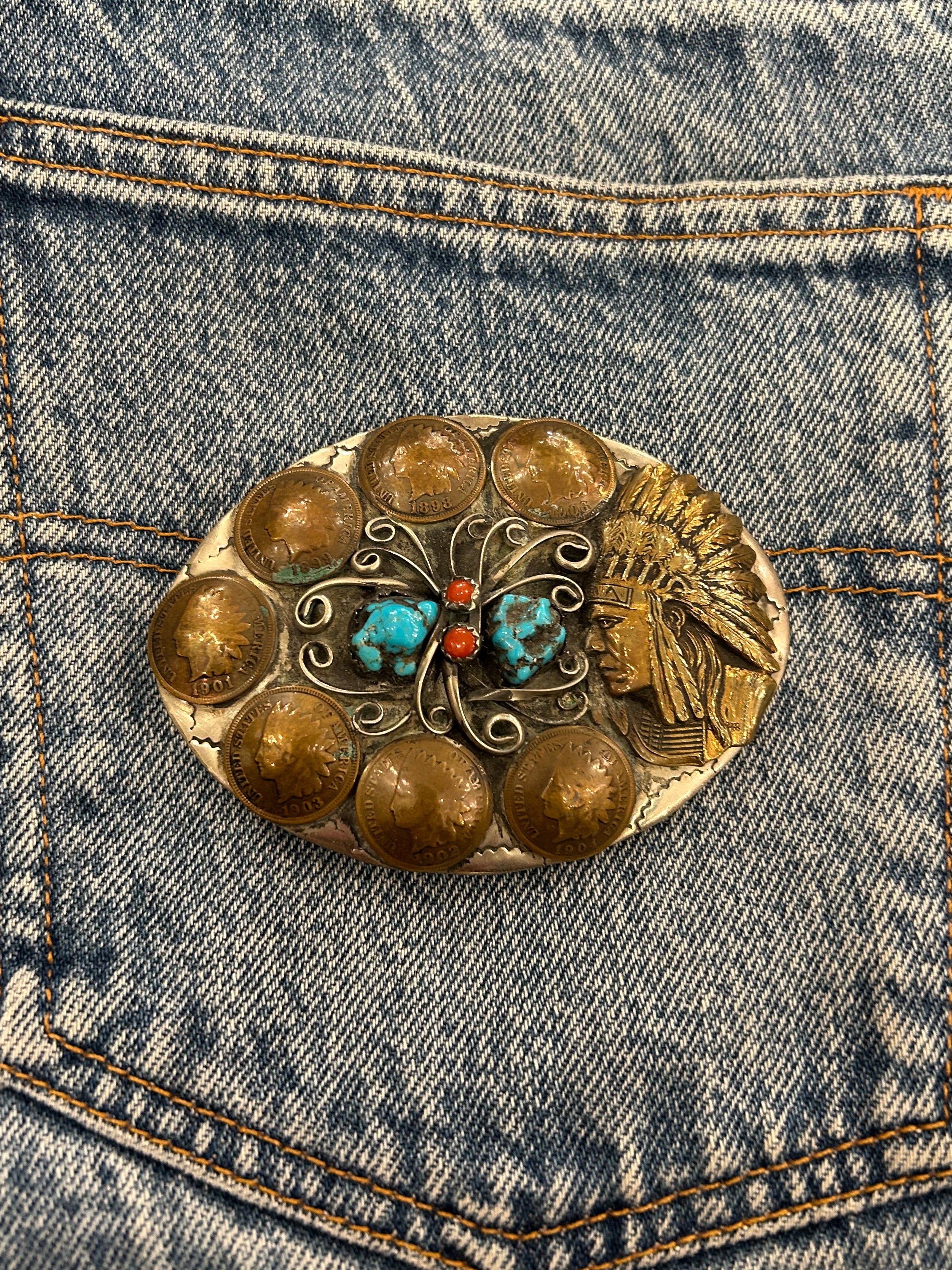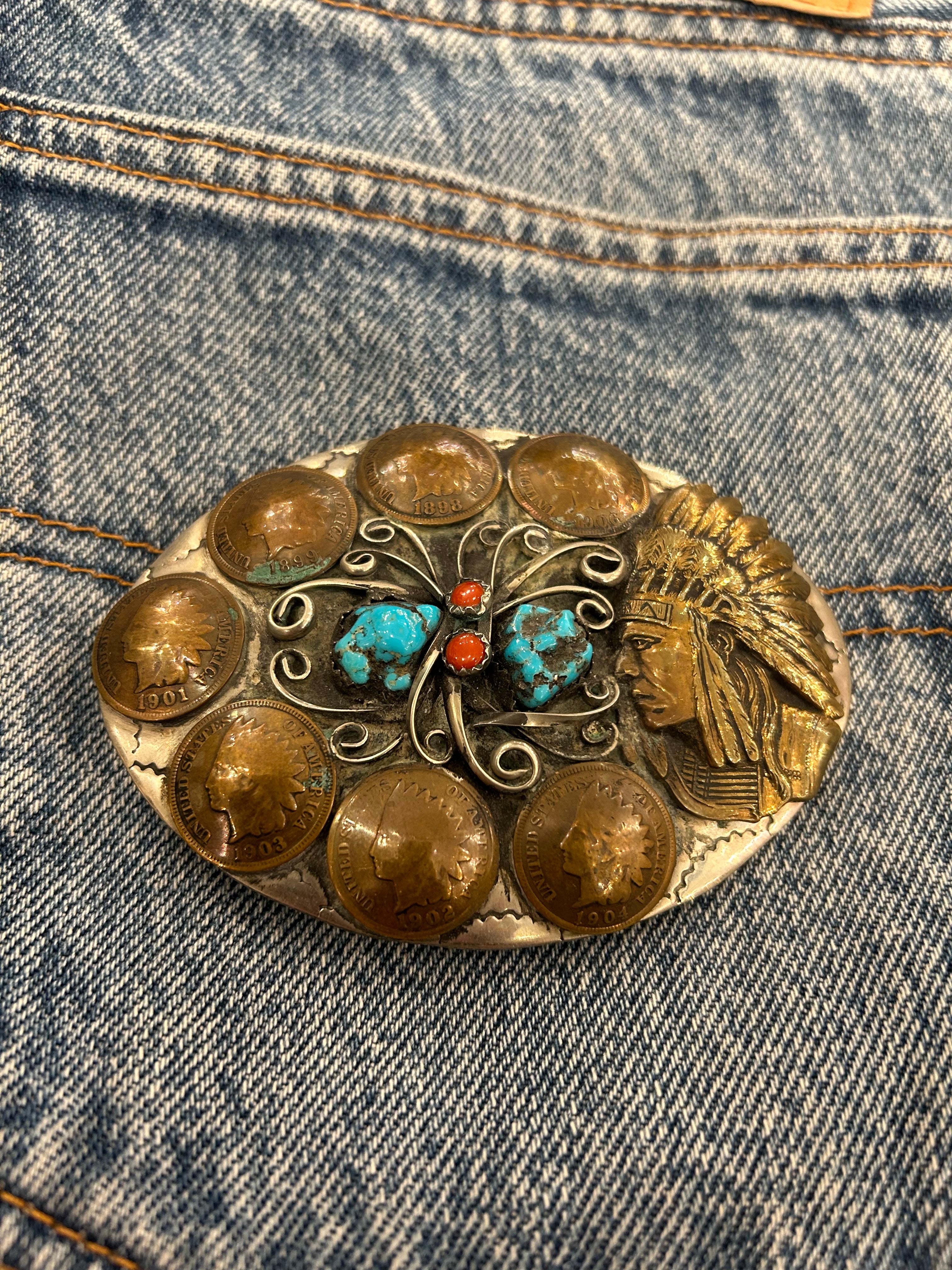 Turquoise, Coral, and Buffalo Pennies Belt Buckle