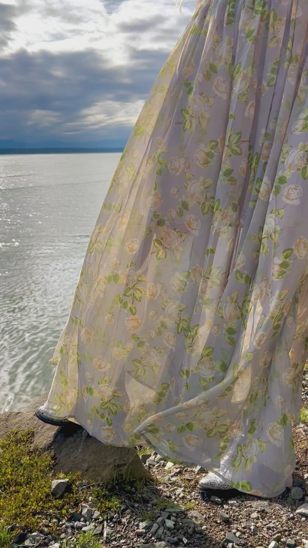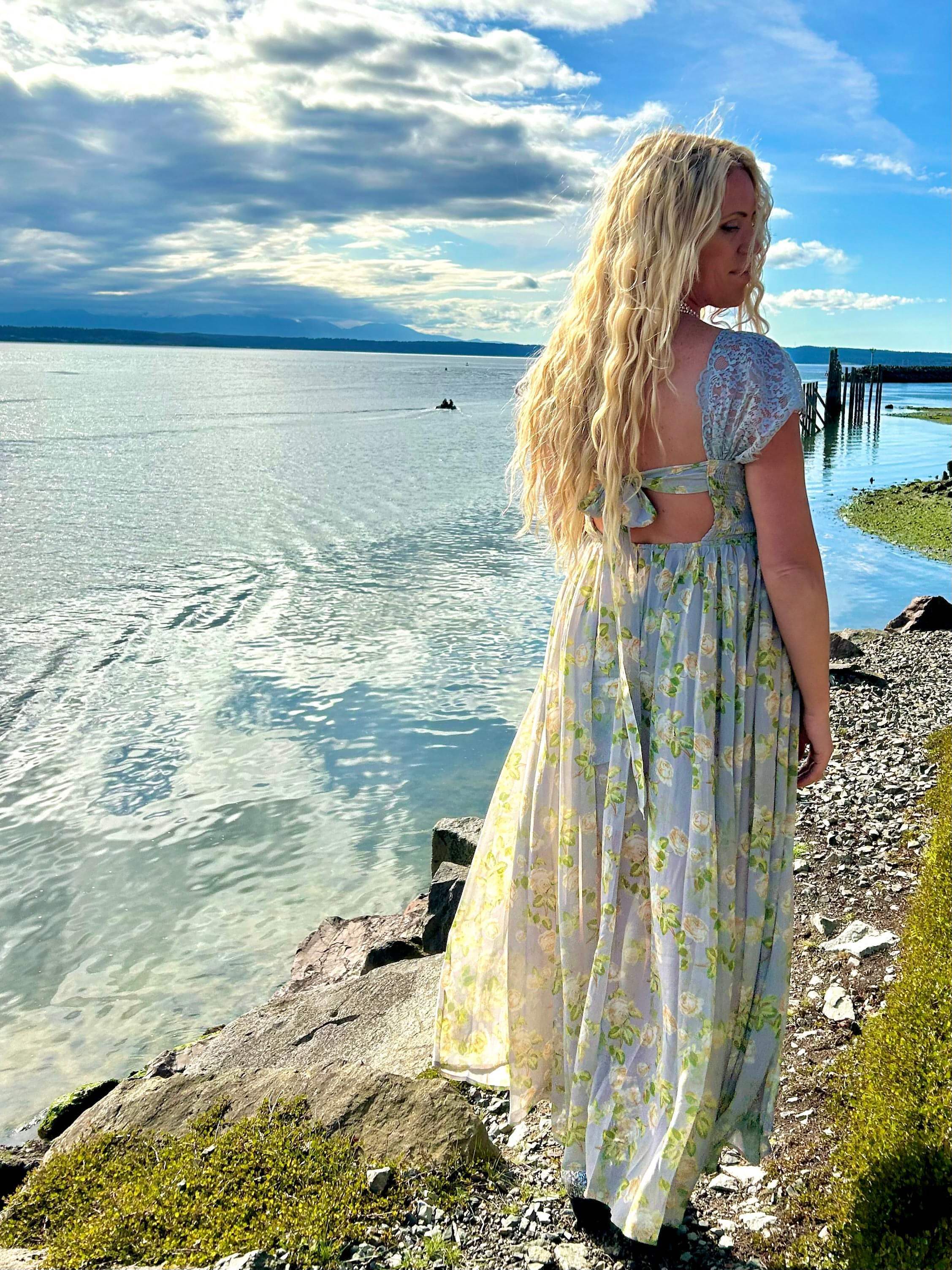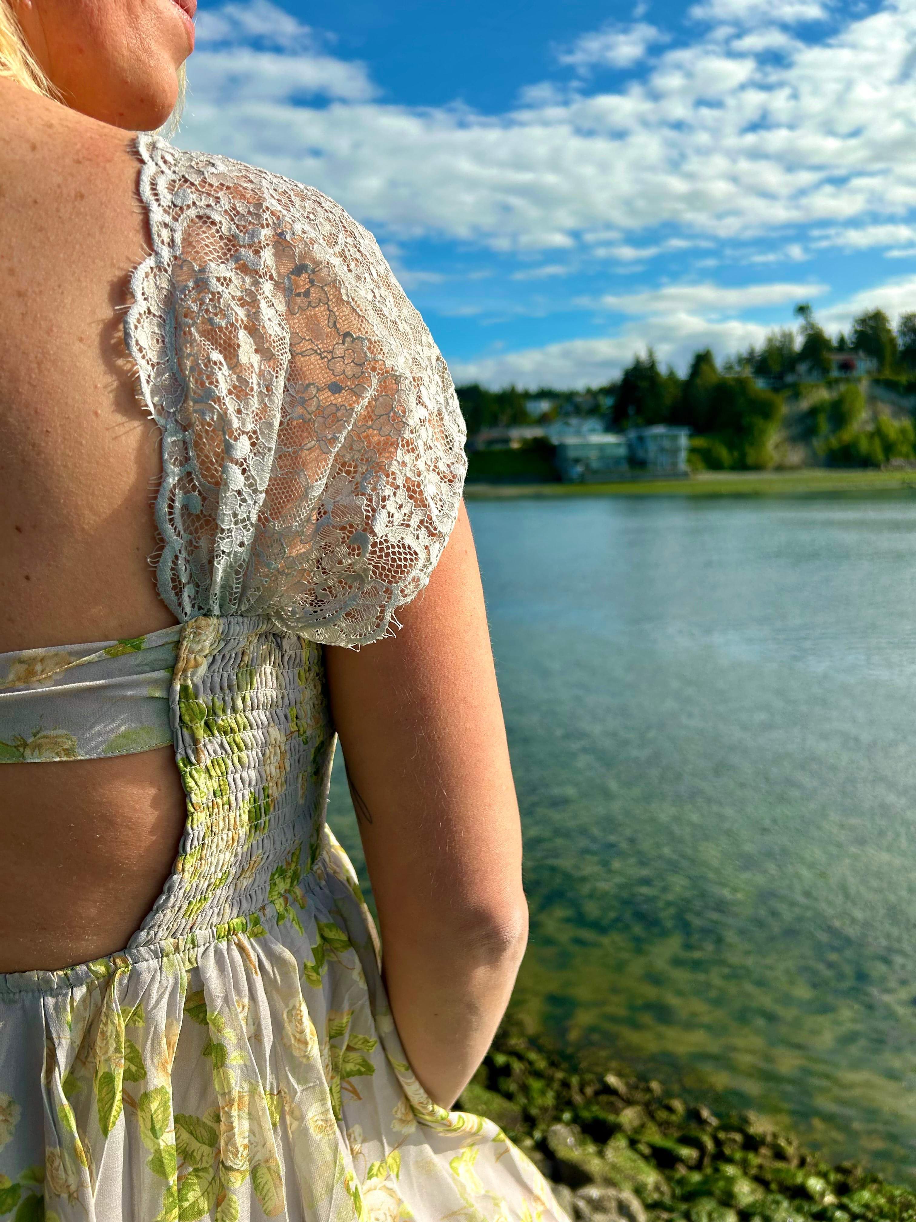 Get ready to turn heads with this beautiful lace detail maxi dress featuring a delicate scalloped bust overlay, laced cap sleeves, gorgeous flowy chiffon floral print fabric, sweeping a line silhouette, smocked back waist for an easy fit with a self tie ribbon, and hidden zipper back. Dress is fully lined.