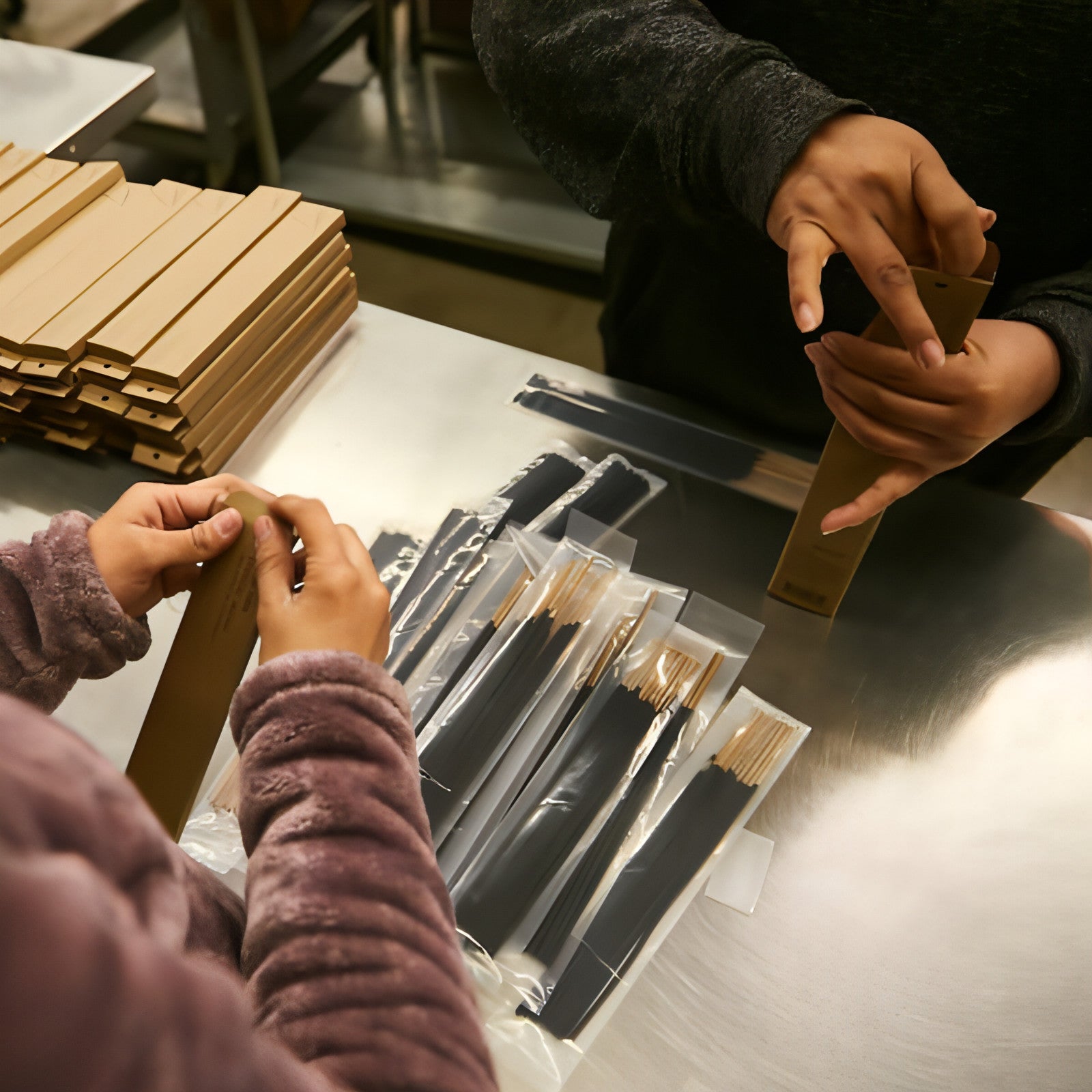 The one that started it all. Some call it the boyfriend scent, we call it the O.G. Notes of leather, teak, and orange. Incense quickly transforms a room: transformative smoke uplifts the space while our signature scents linger for hours even after extinguishing. Our charcoal-based Incense is hand-dipped in-house using fine fragrance oils and dipropylene glycol (DPG), a synthetic base commonly found in body care and home fragrance products. Each stick burns for 1 hour; depending on room size, scent longevity lasts between 2-4 hours. 15 sticks in a plastic sleeve inside of each kraft package, measuring 10.75" long each.