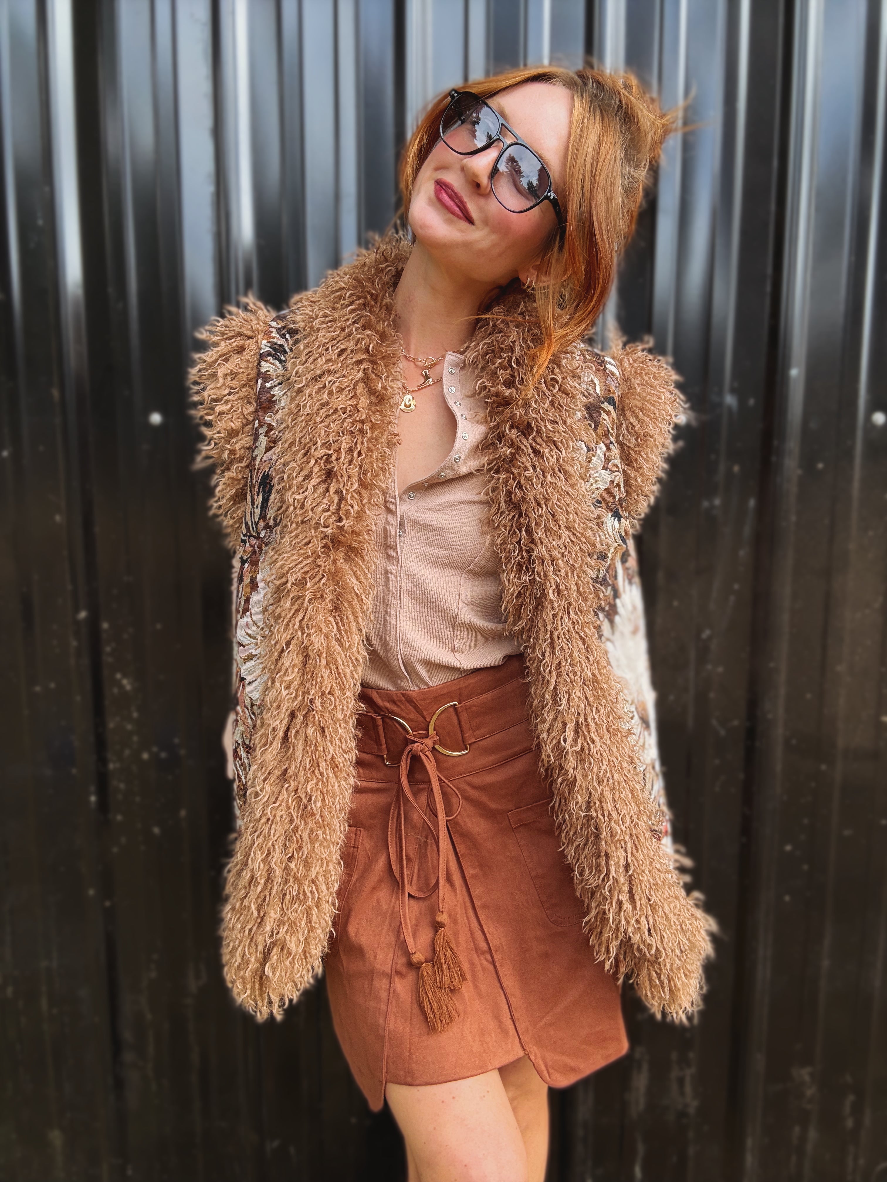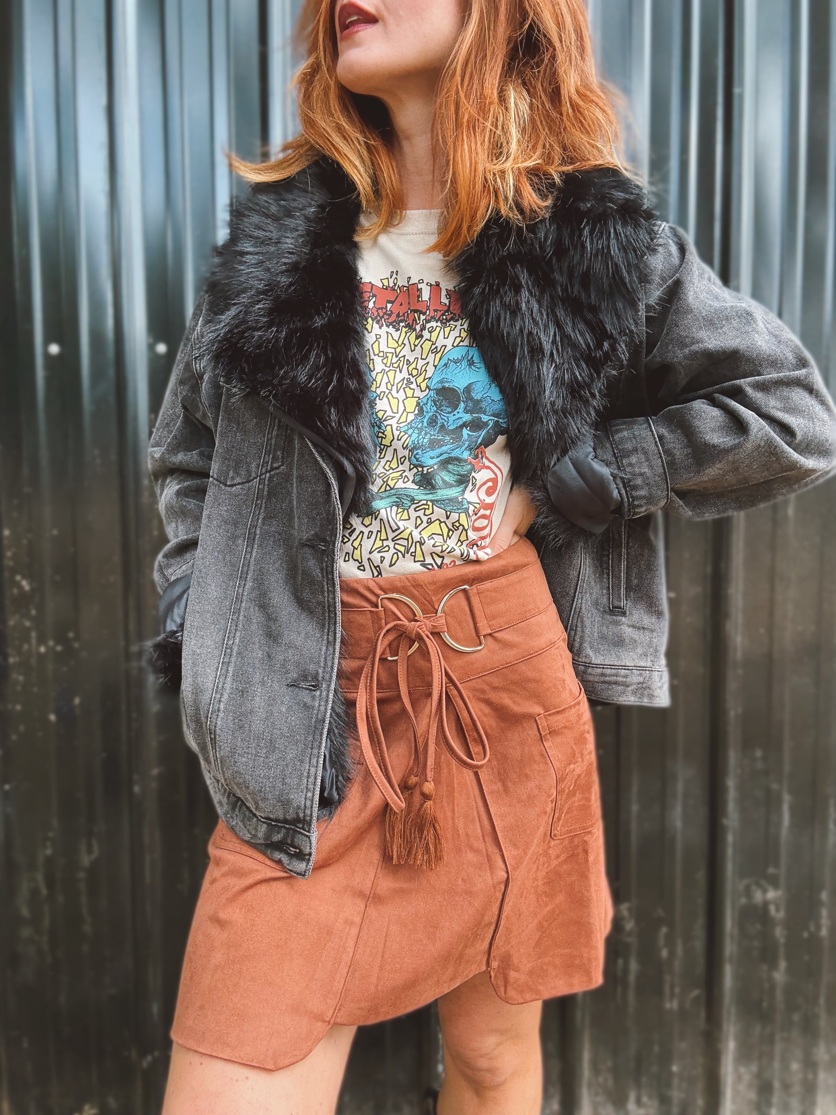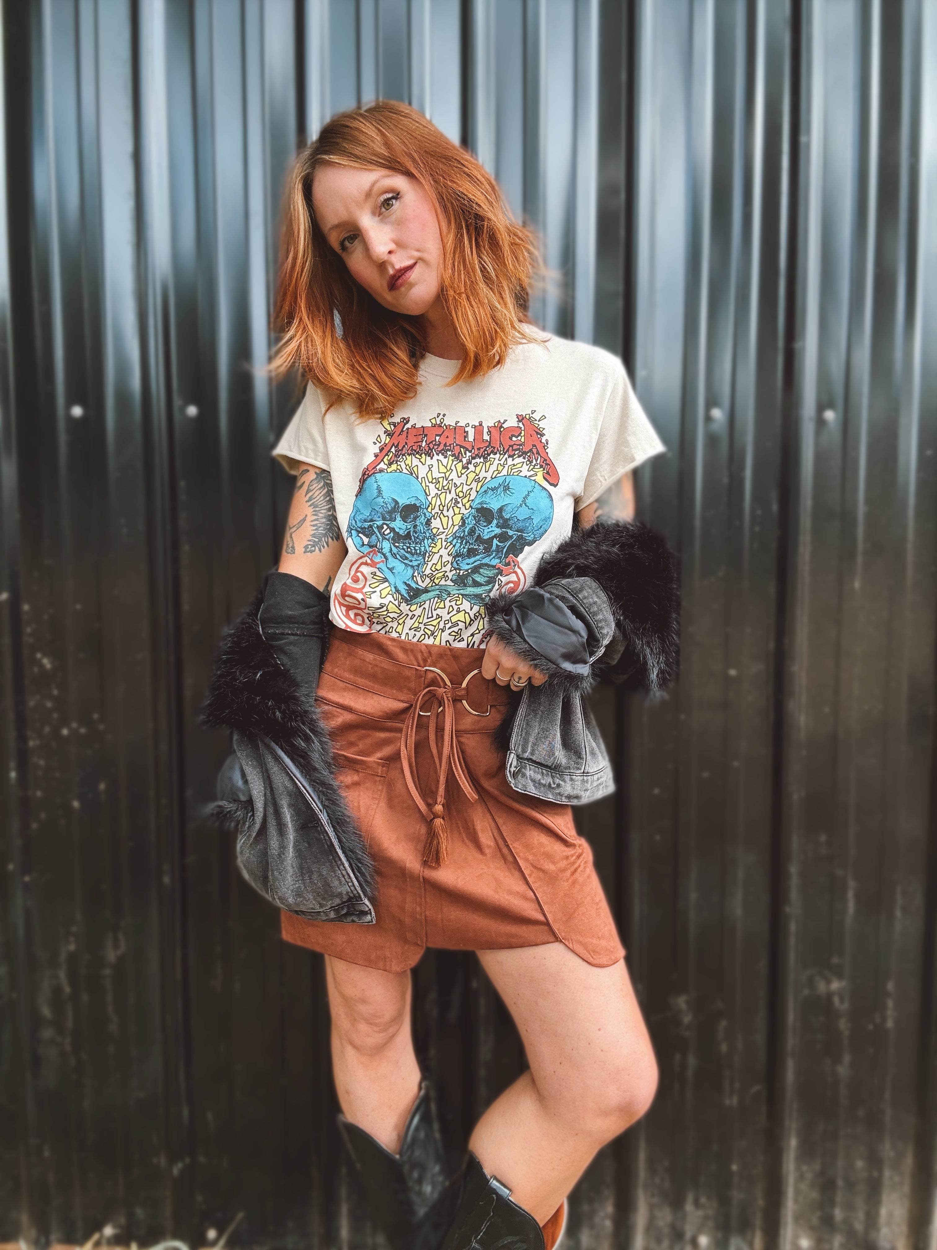 Welcome to your new fall uniform. This 70s western mini is the perfect fall layering piece. With a faux wrap look, the front belt loops will adjust the waist. The tassel ends on the tie adds the perfect western detail. Can be worn as a mid rise or high rise.