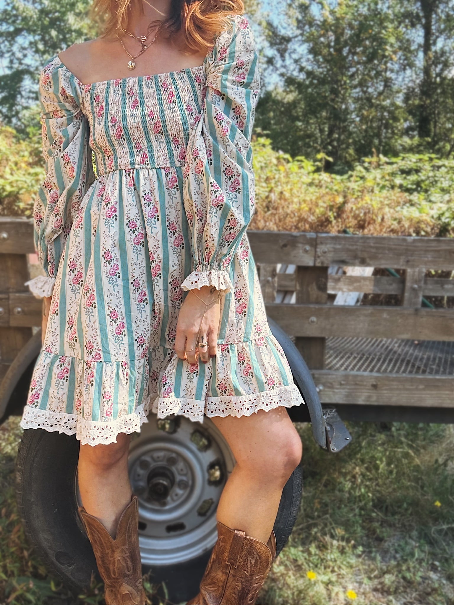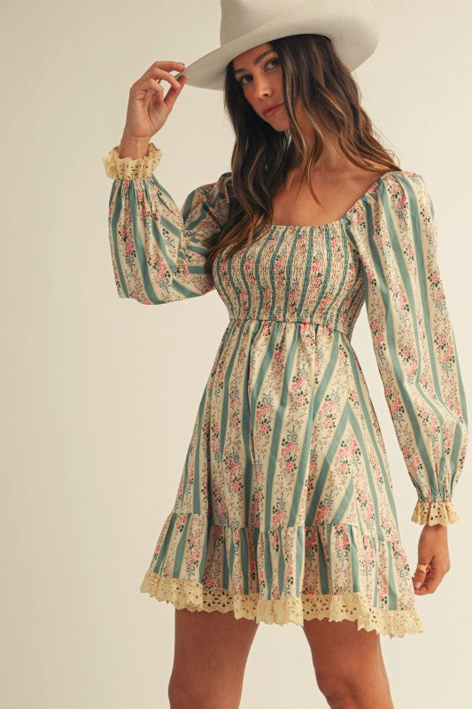 The Just In Case Mini Dress is the perfect choice for a country concert look, featuring floral smocked lace detail for a flattering fitted bodice that keeps you comfortable all day and night. Its soft pastel hues add a touch of sweet, laid-back charm, making it easy to pair with boots and a denim jacket for effortless country style. With a lace trip at the cuff of the sleeve and skirt hem, this is the sweetest addition to your fall wardrobe.
