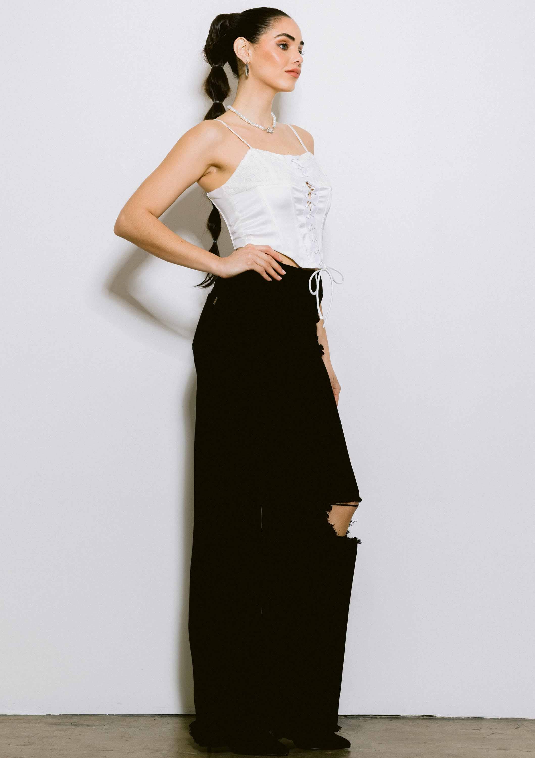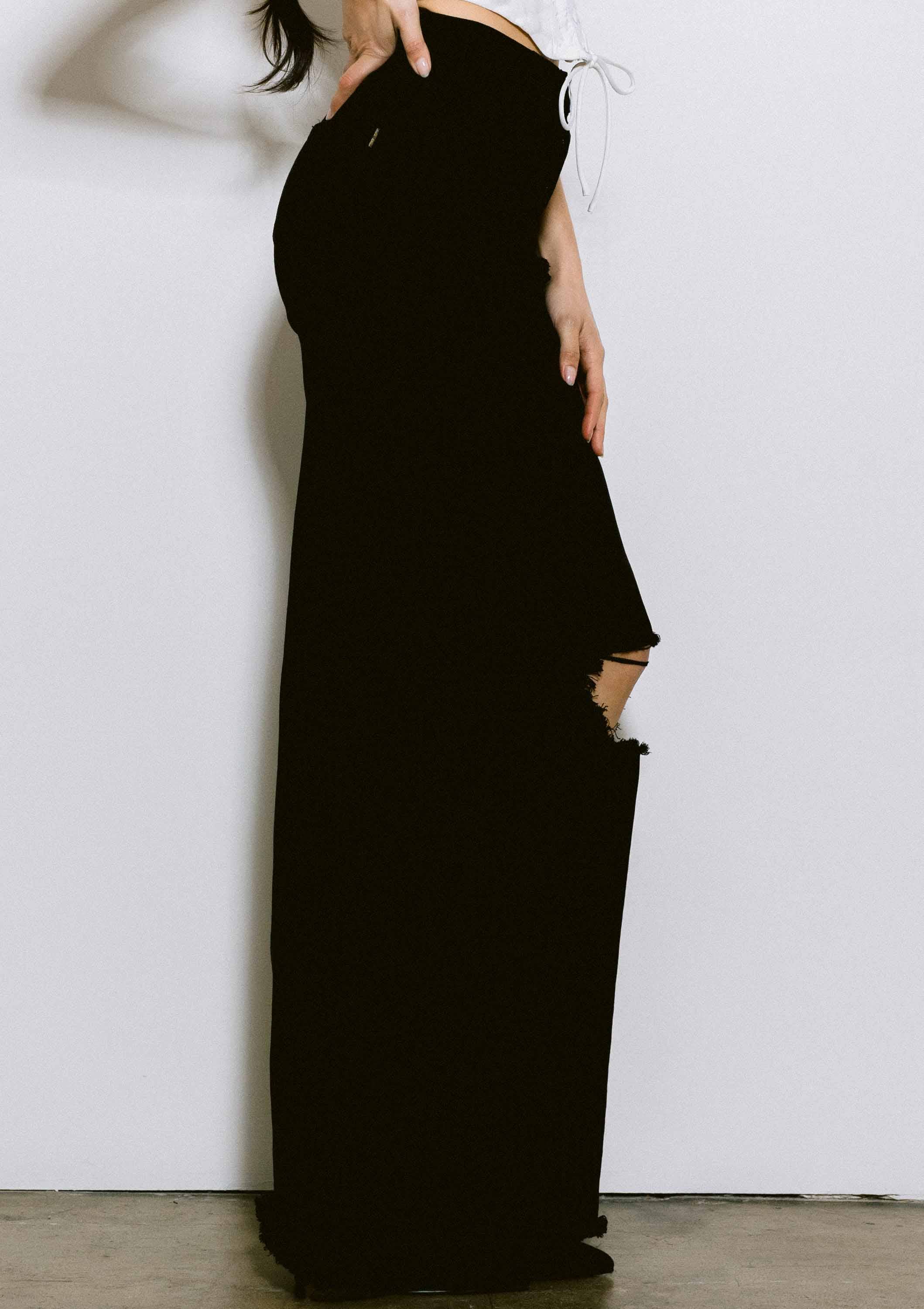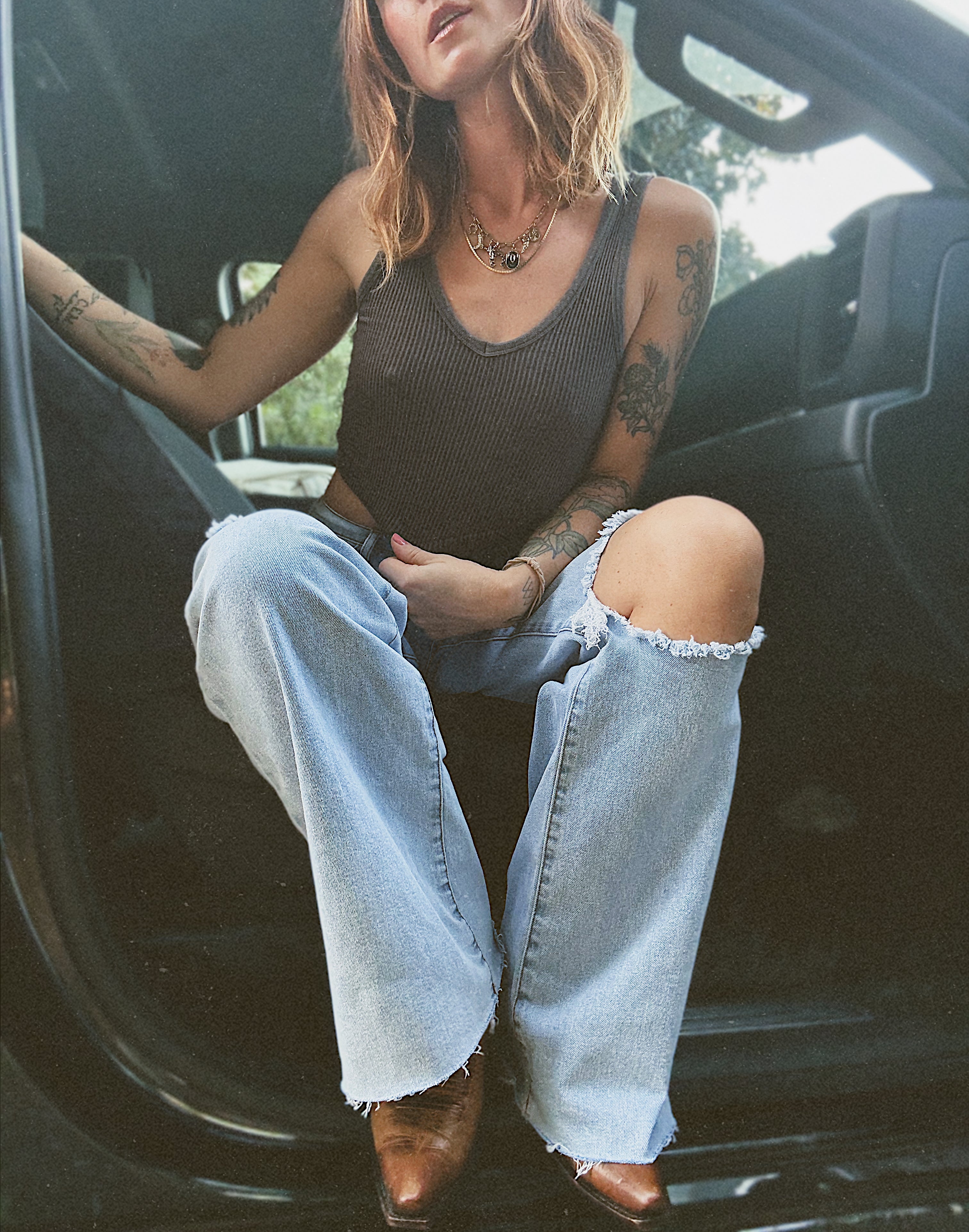A pair of high-rise slouchy jeans featuring pintucked waist line, classic five pockets, knee part distress, and zip-fly closure.