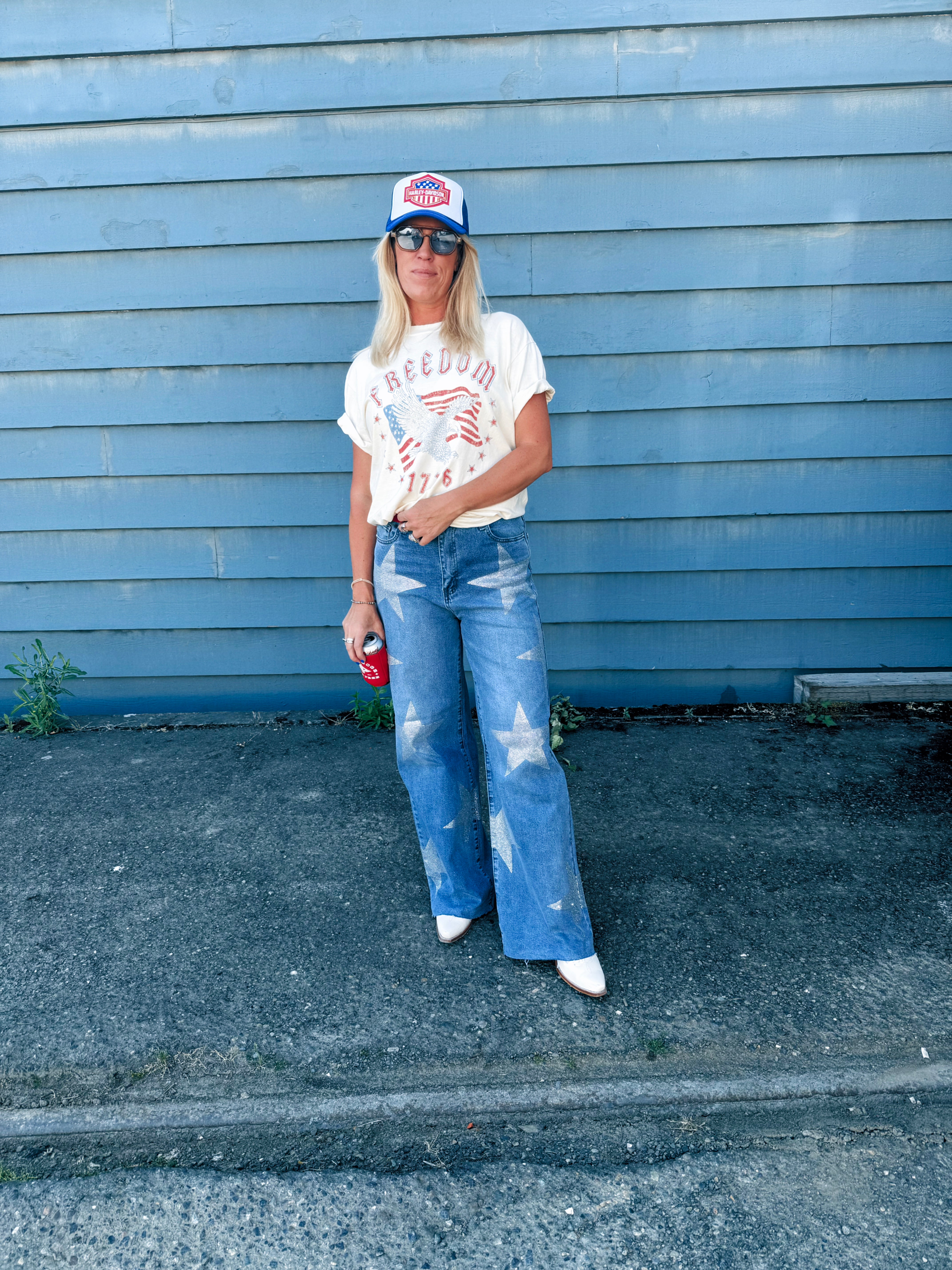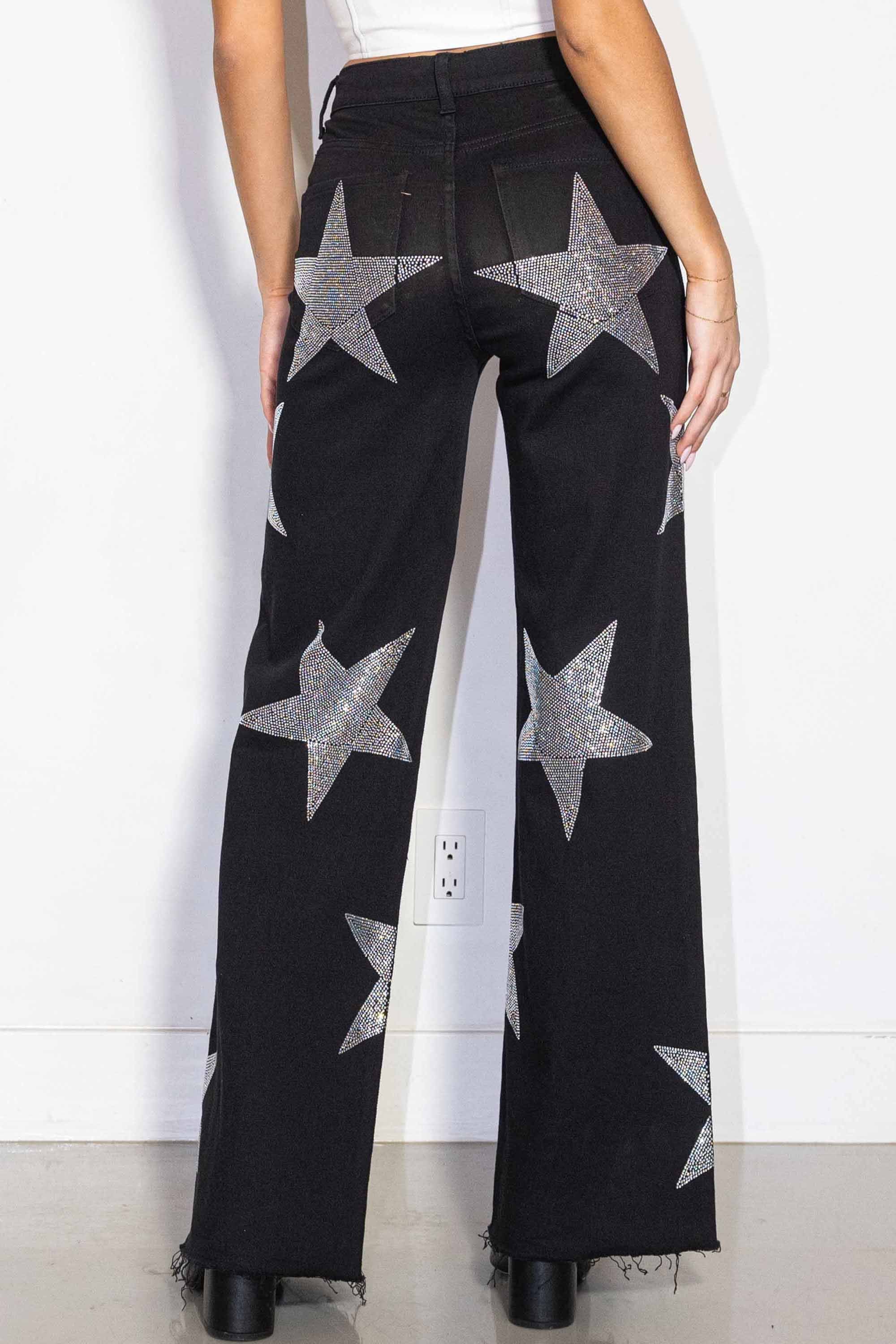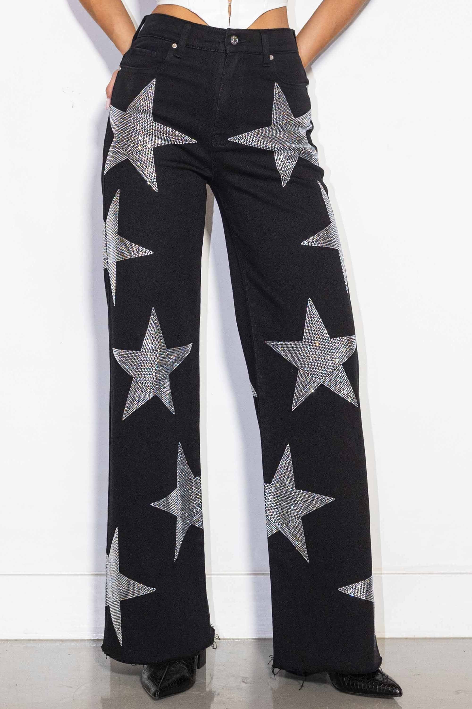 A pair of high-rise wide jeans featuring star shape rhinestone detail, classic 5-pocket construction and zip-fly closure.