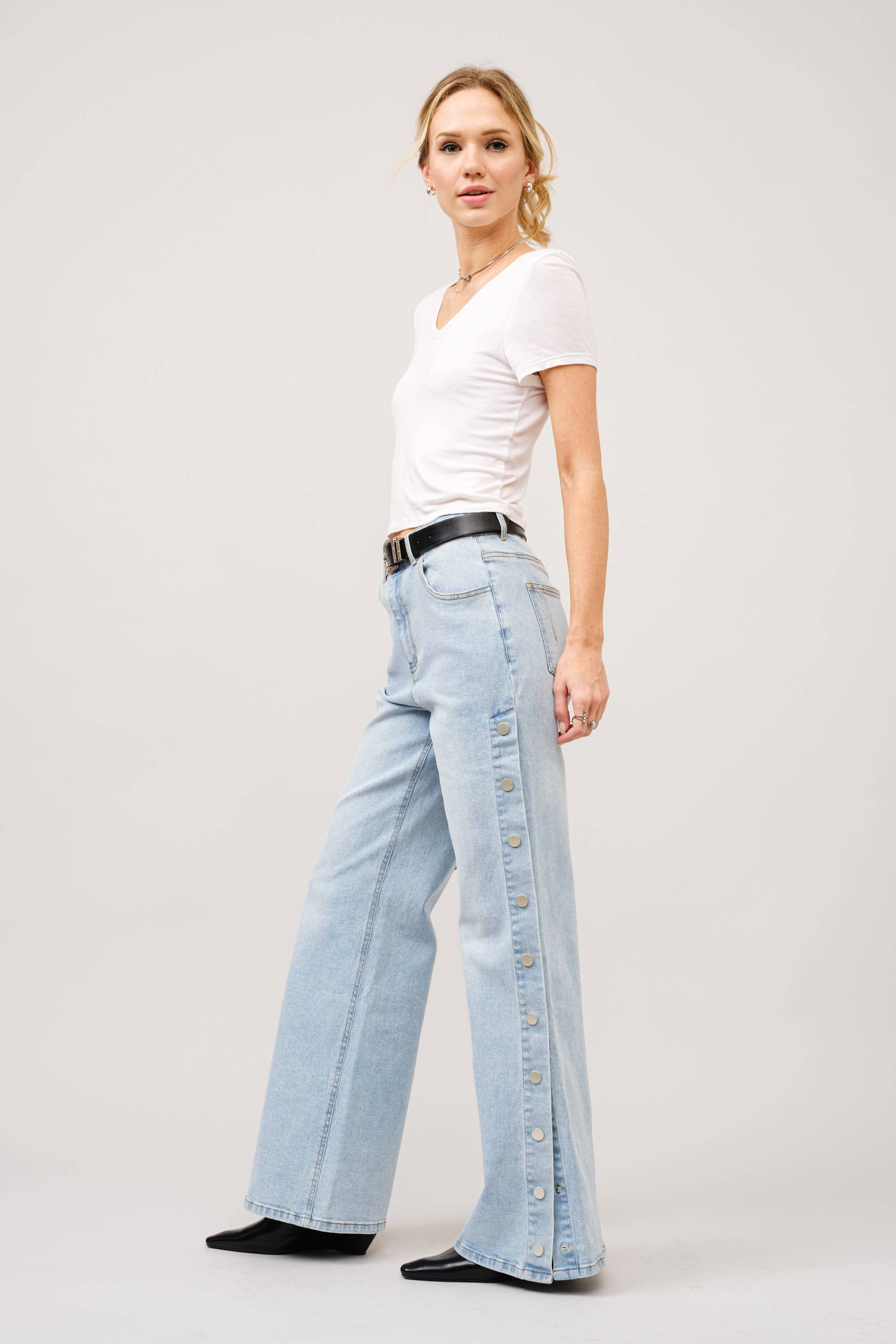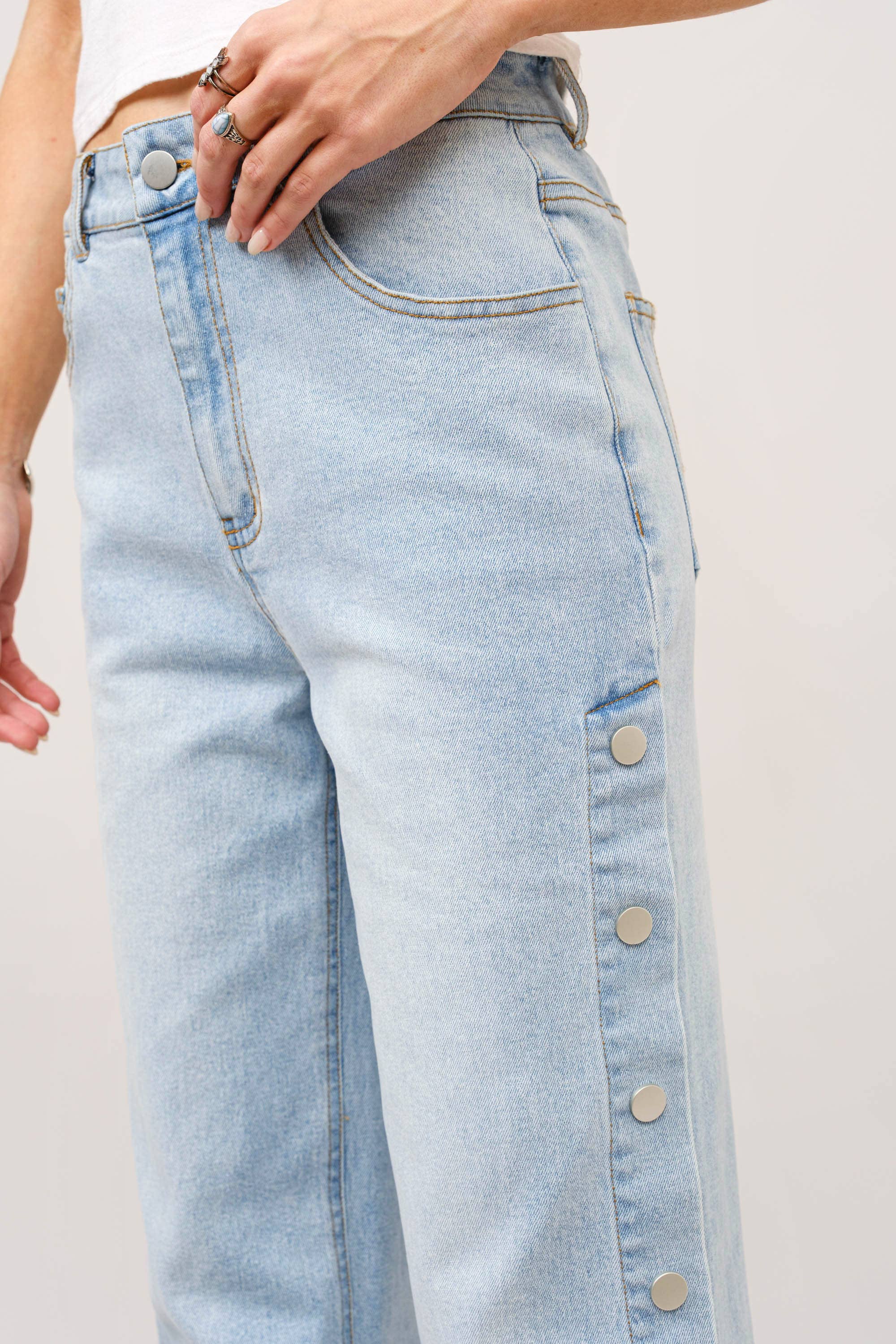 These wide leg jeans feature side panel snap details and a mid-rise fit, adding a unique touch to a classic style. Throw these one with a sneaker or your favorite boot and you're ready to go.