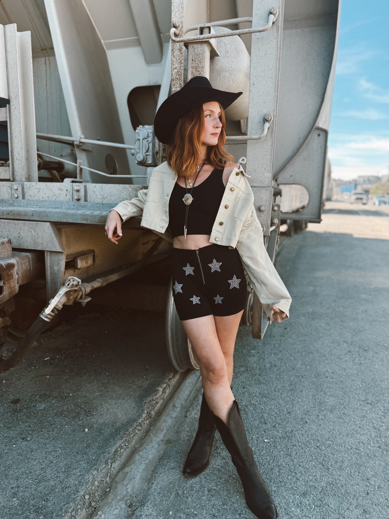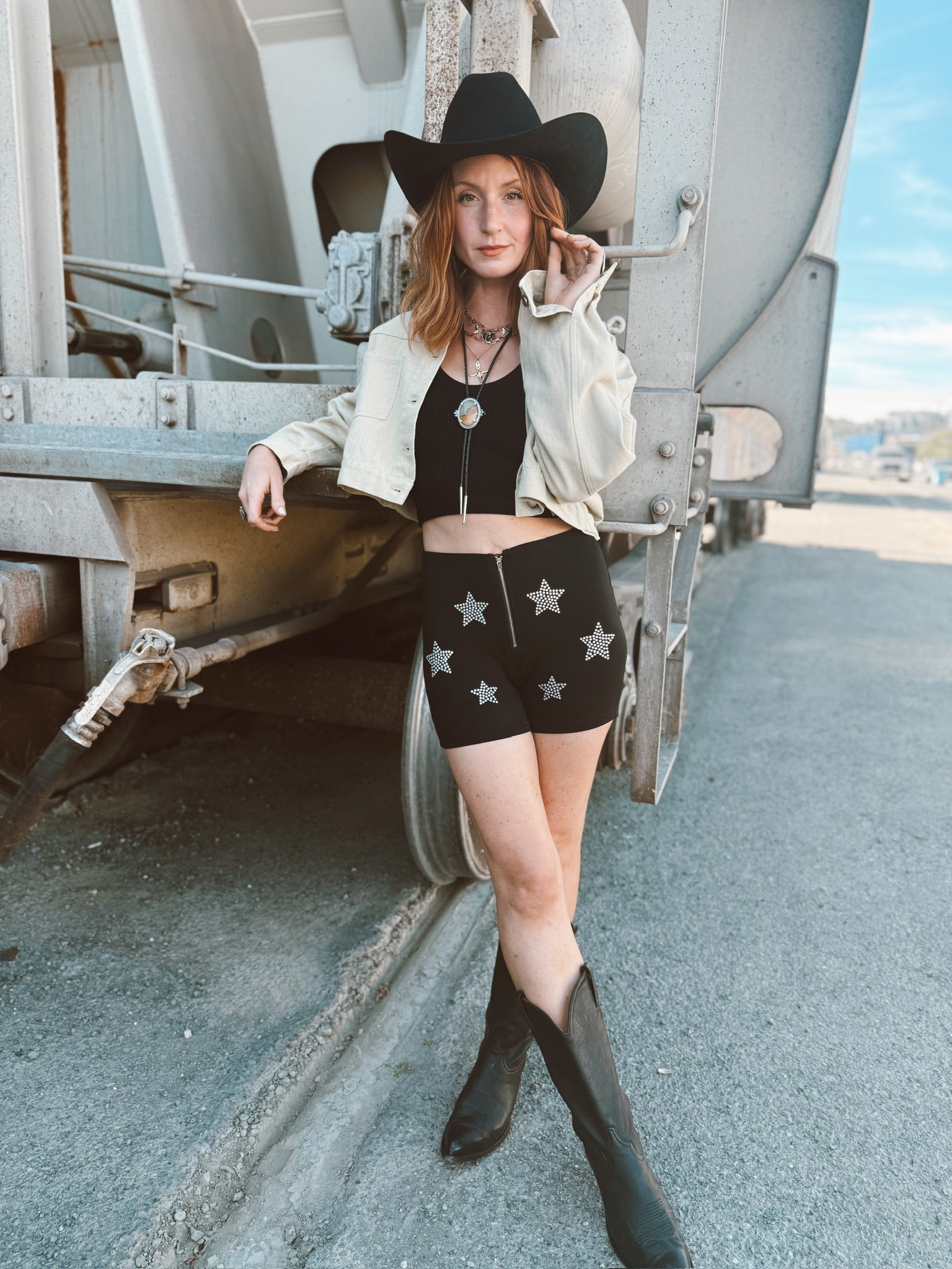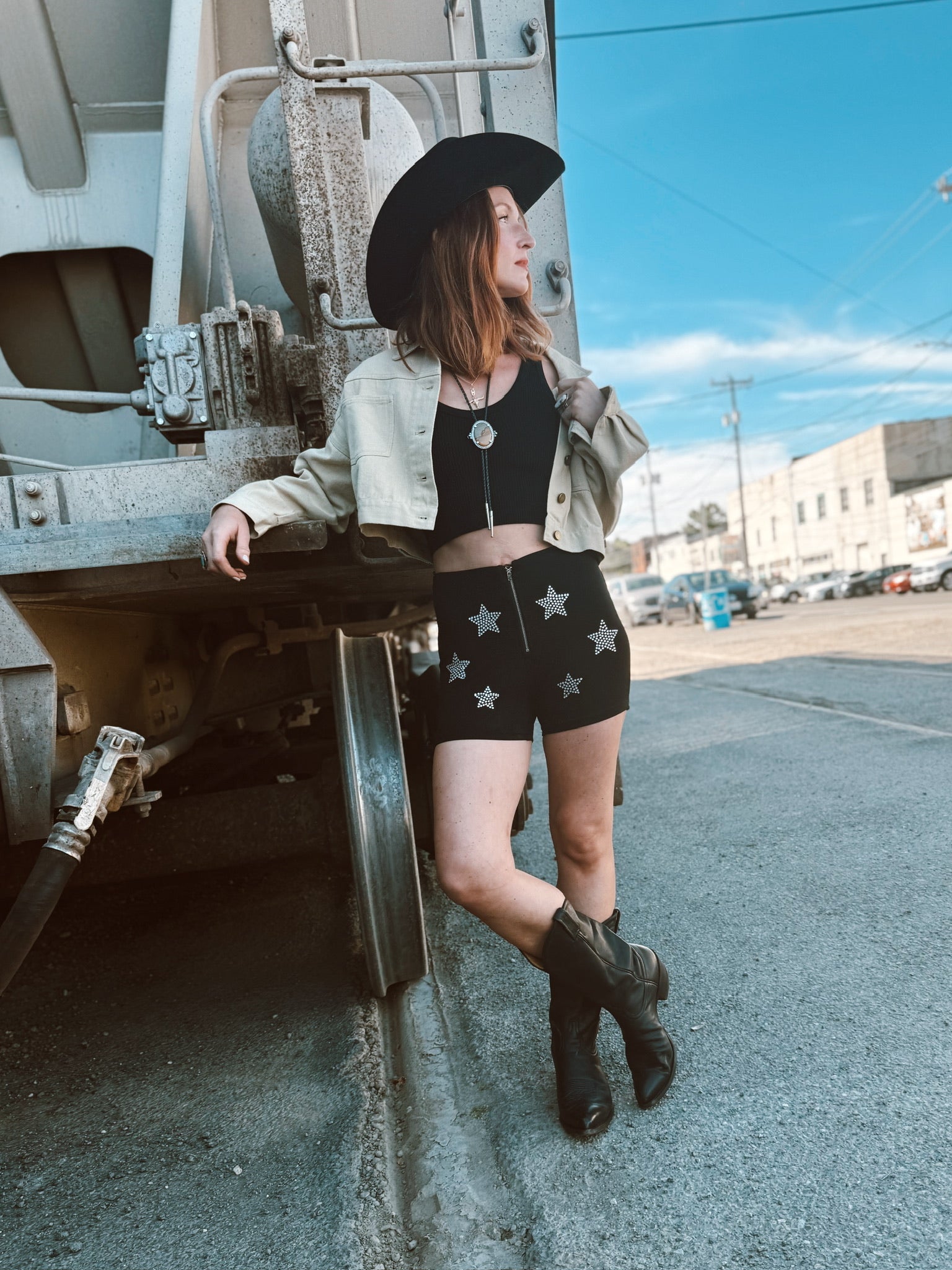 These Zip Up Star Shorts are for the showgirl inside of you! Throw on with a chop shop band tee and run to your concert, festival, or summer celebration.