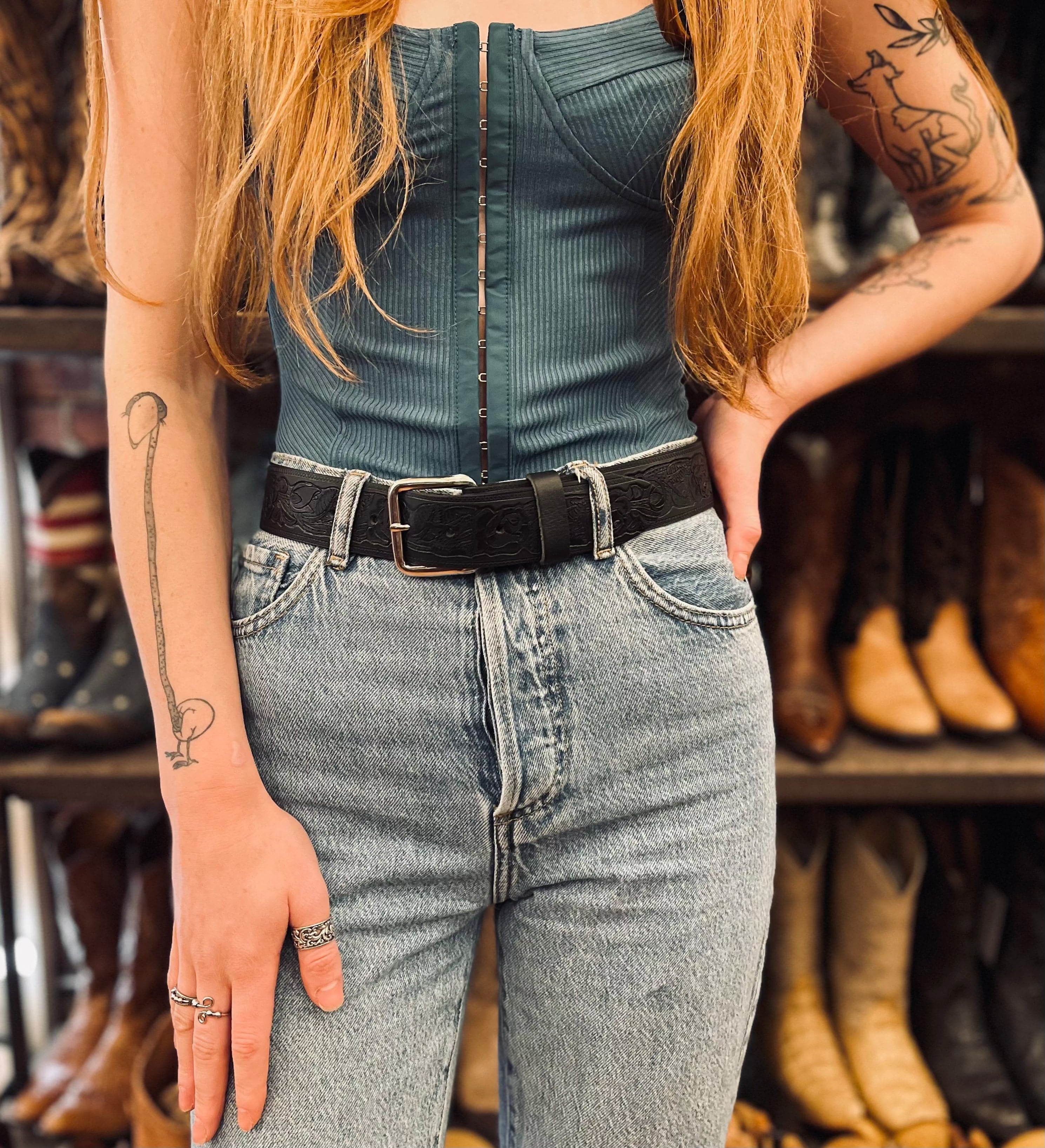 Our best selling rose pattern embossed genuine leather belt. Proudly made in the USA. Has removable buckle, so you can add your own belt buckle to customize your look.