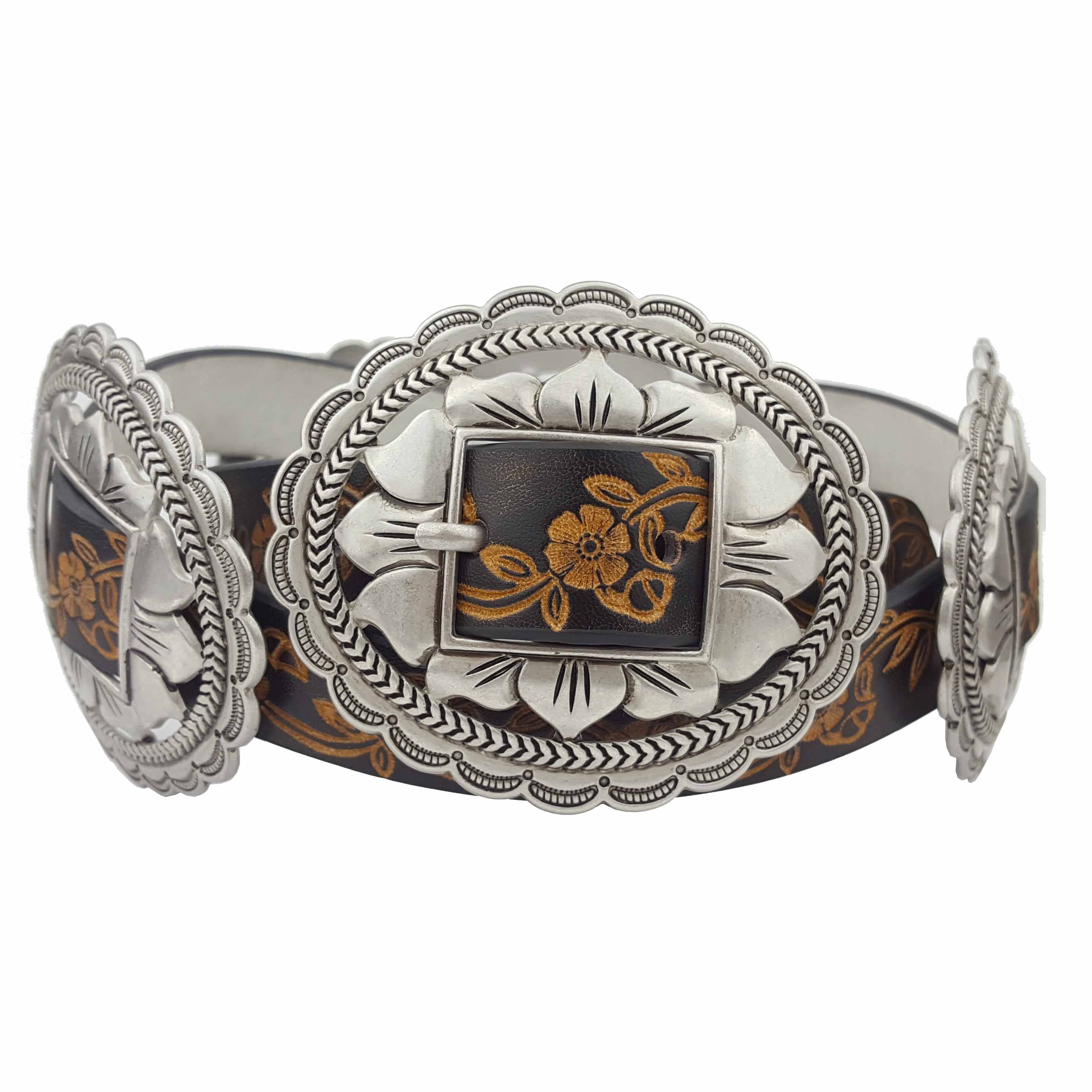 Width is 1" or 25 mm Very popular Western oval with floral etched with matching conchos Tan with Brass Hardware. Made with quality hand painted leatherette and a beige leather lining