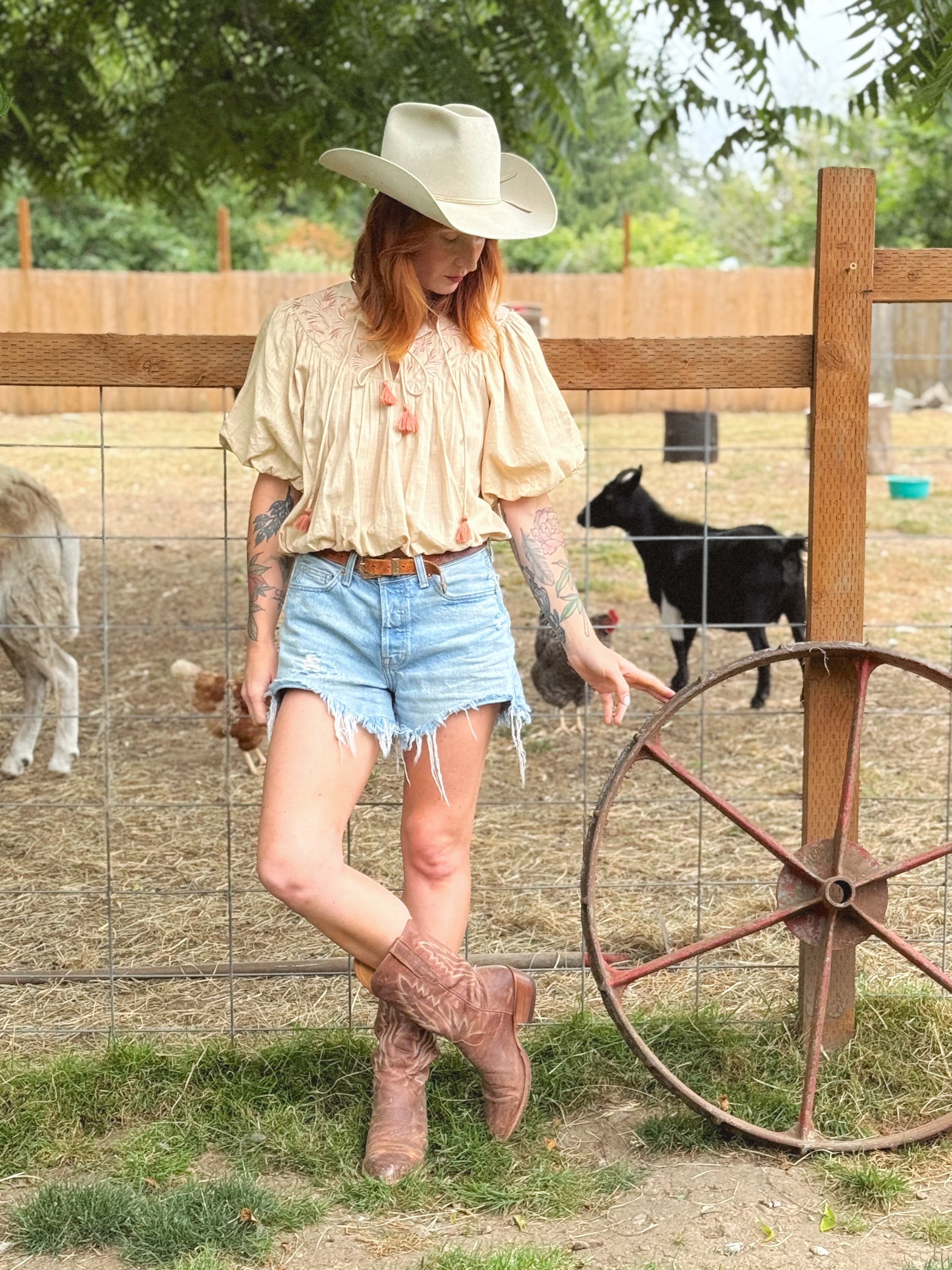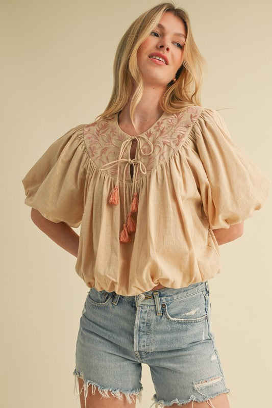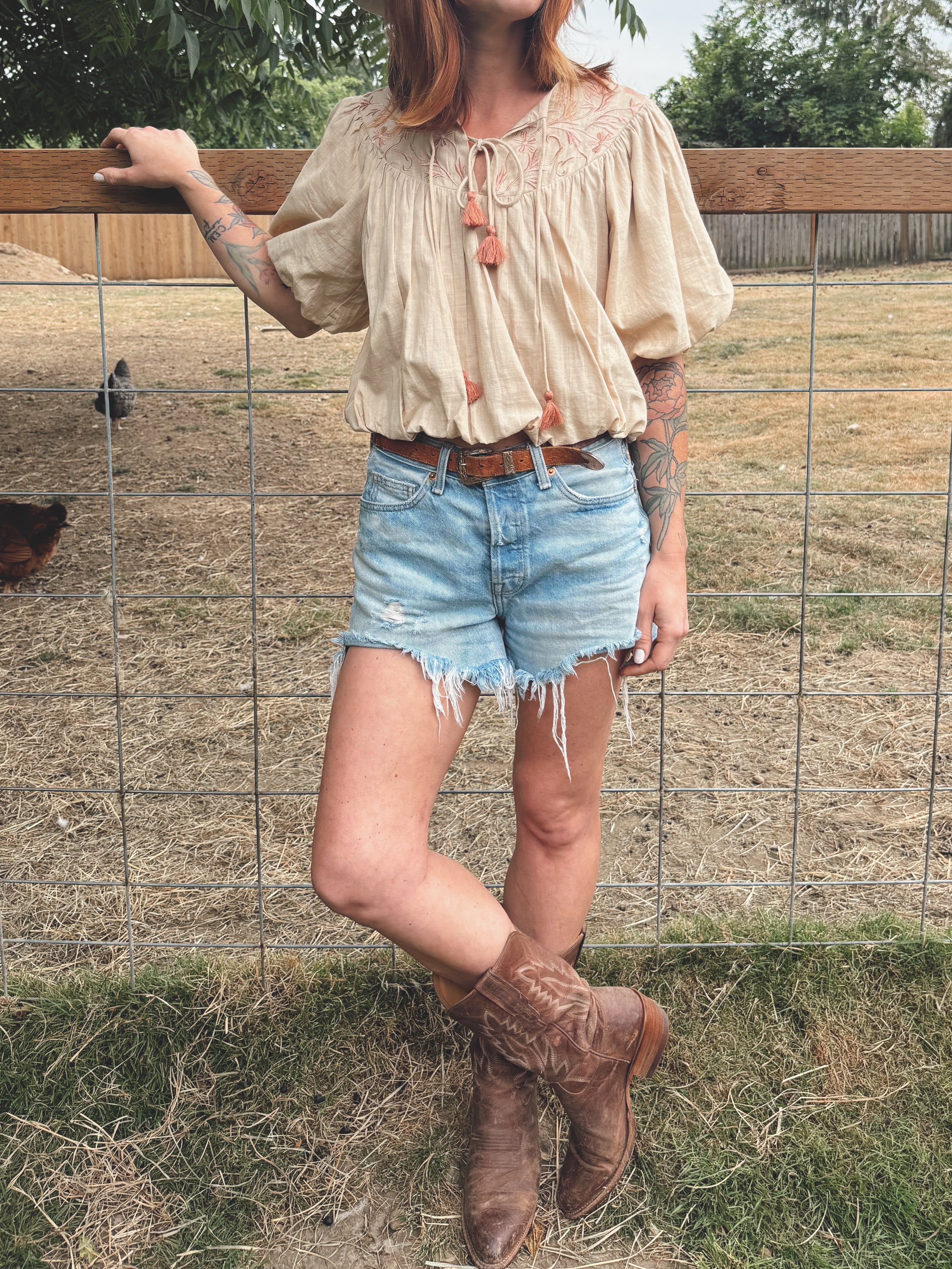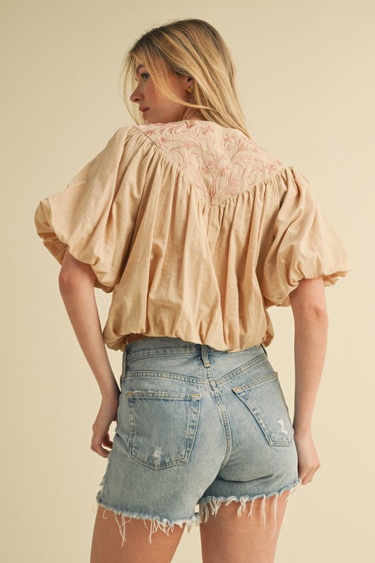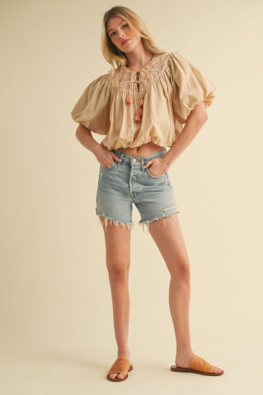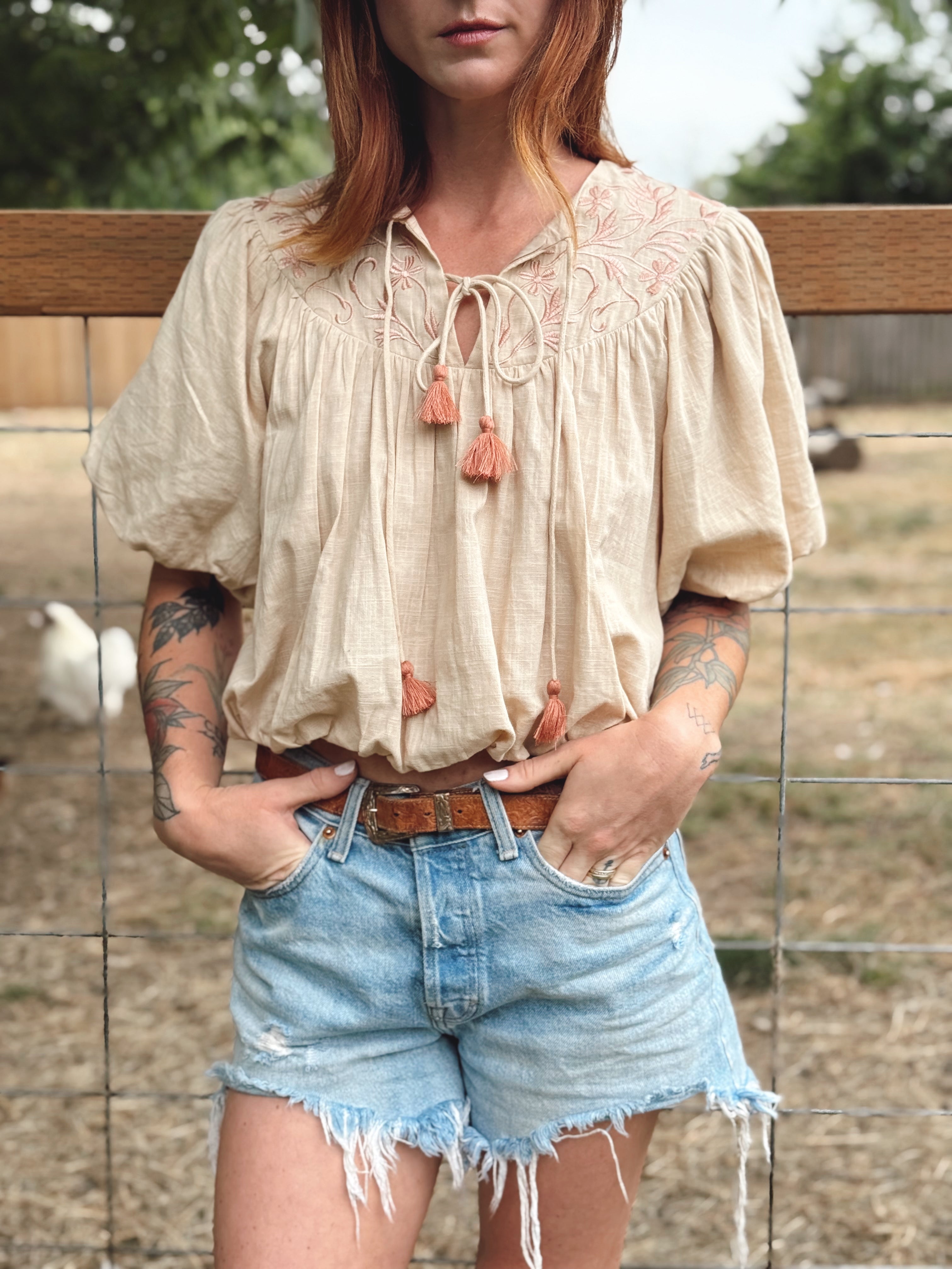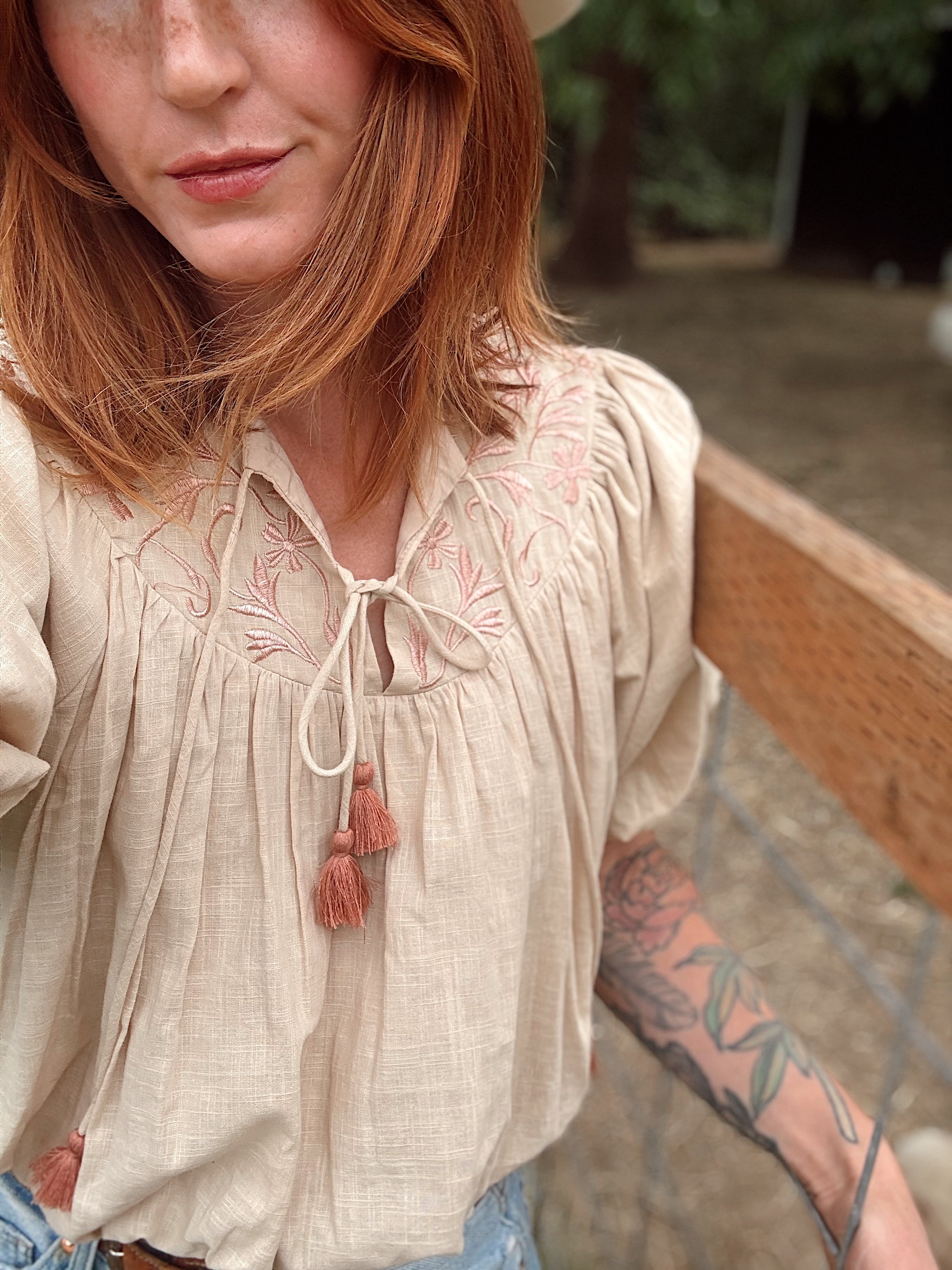 The Alia Embroidered Top offers soft cotton comfort with a touch of boho hippie vibes. Its delicate embroidery and relaxed fit make it perfect for easygoing summer days.
