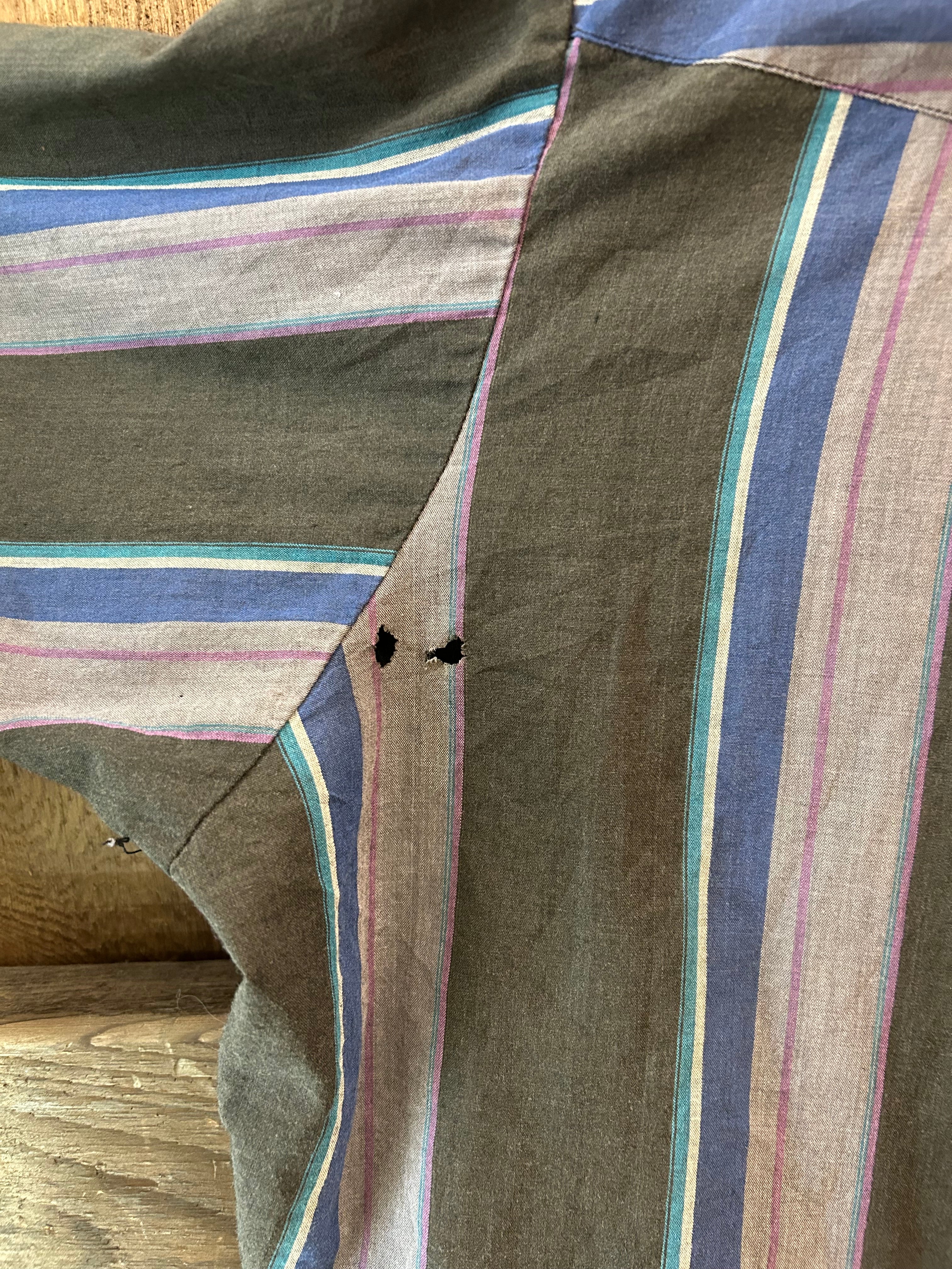 - Small holes just above left pocket and on the left sleeve