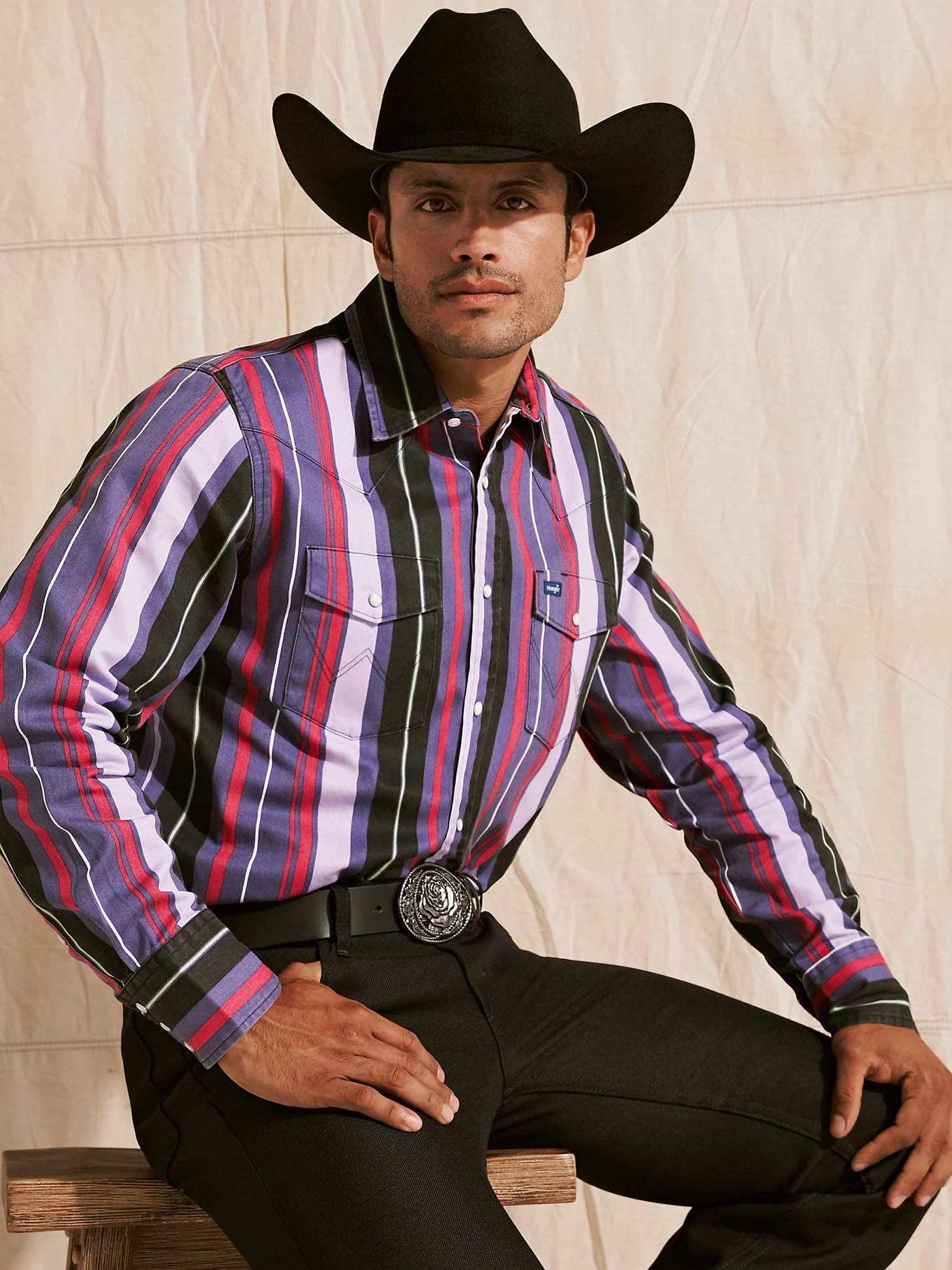 The Wrangler Vintage Inspired Brushpopper Striped Snap Up shirt is a Western legend reimagined. With its bold purple, red, and black stripe pattern, pearl snap buttons, and signature pointed yokes, this shirt is built for both grit and style. Its classic fit makes it easy to move in, whether you’re working hard, two-stepping, or kicking back. A true nod to Wrangler’s vintage rodeo roots, the Brushpopper brings that retro cowboy edge into today’s scene. Pair it with denim and boots for an unmistakably Western look.