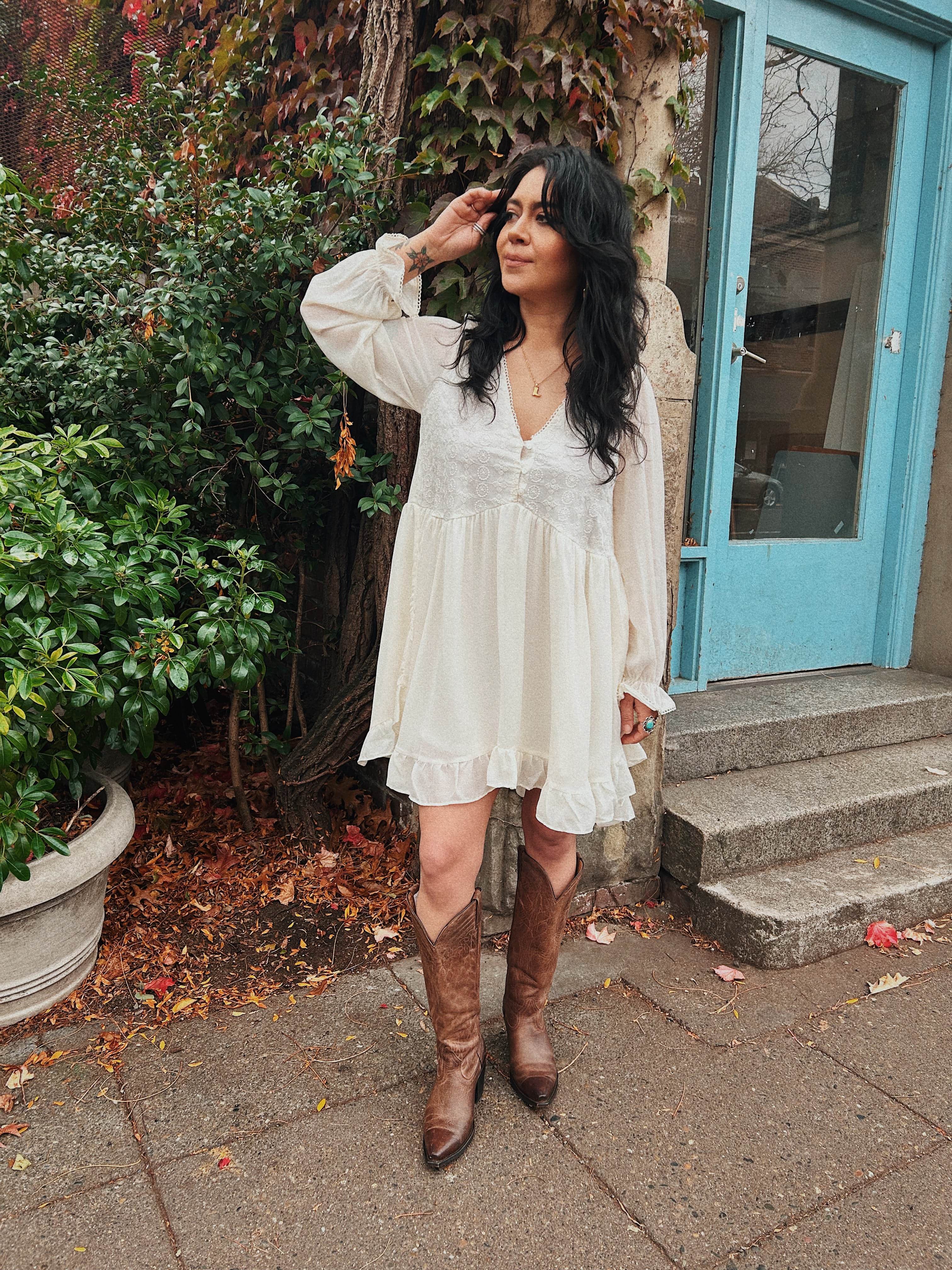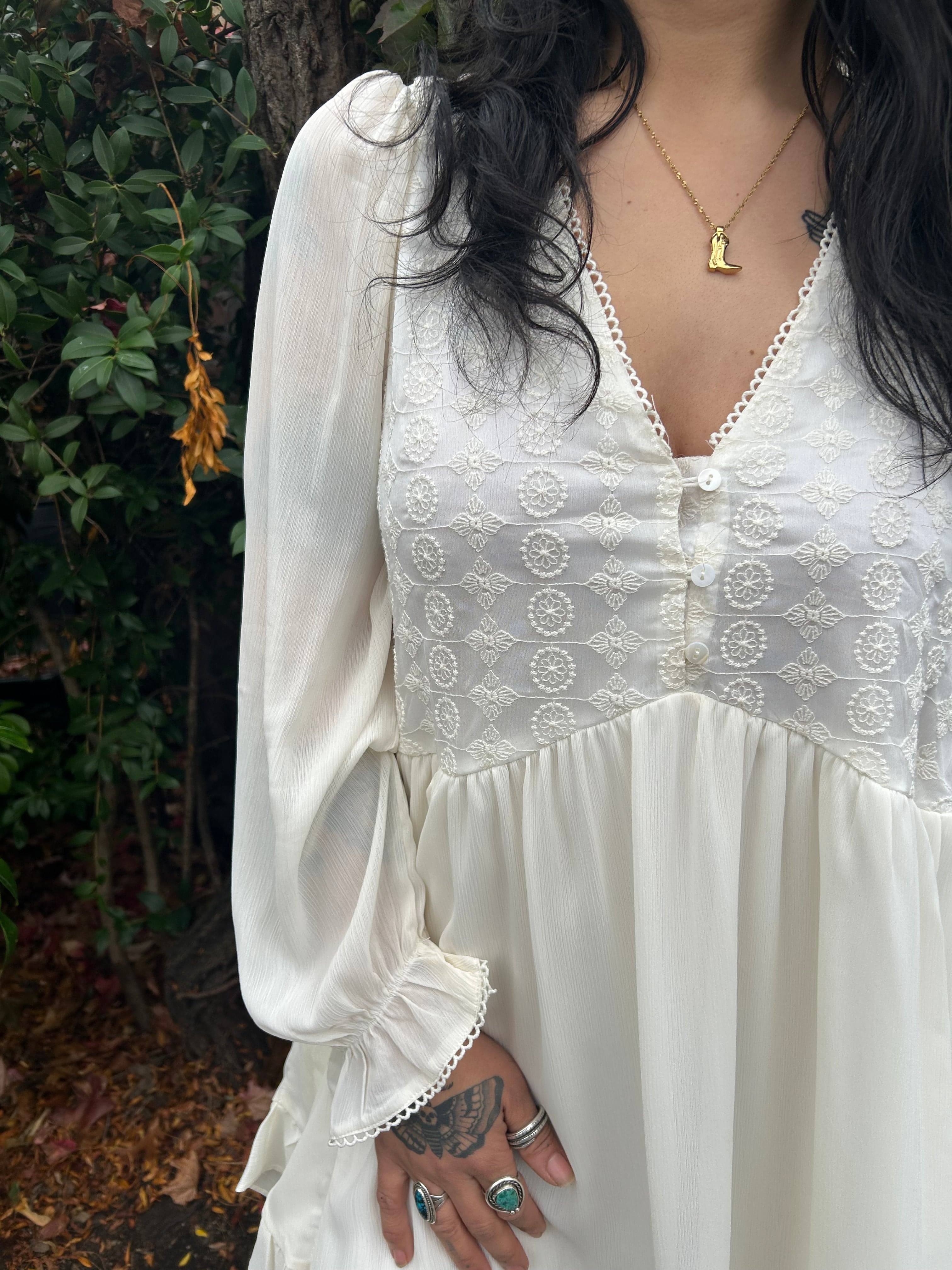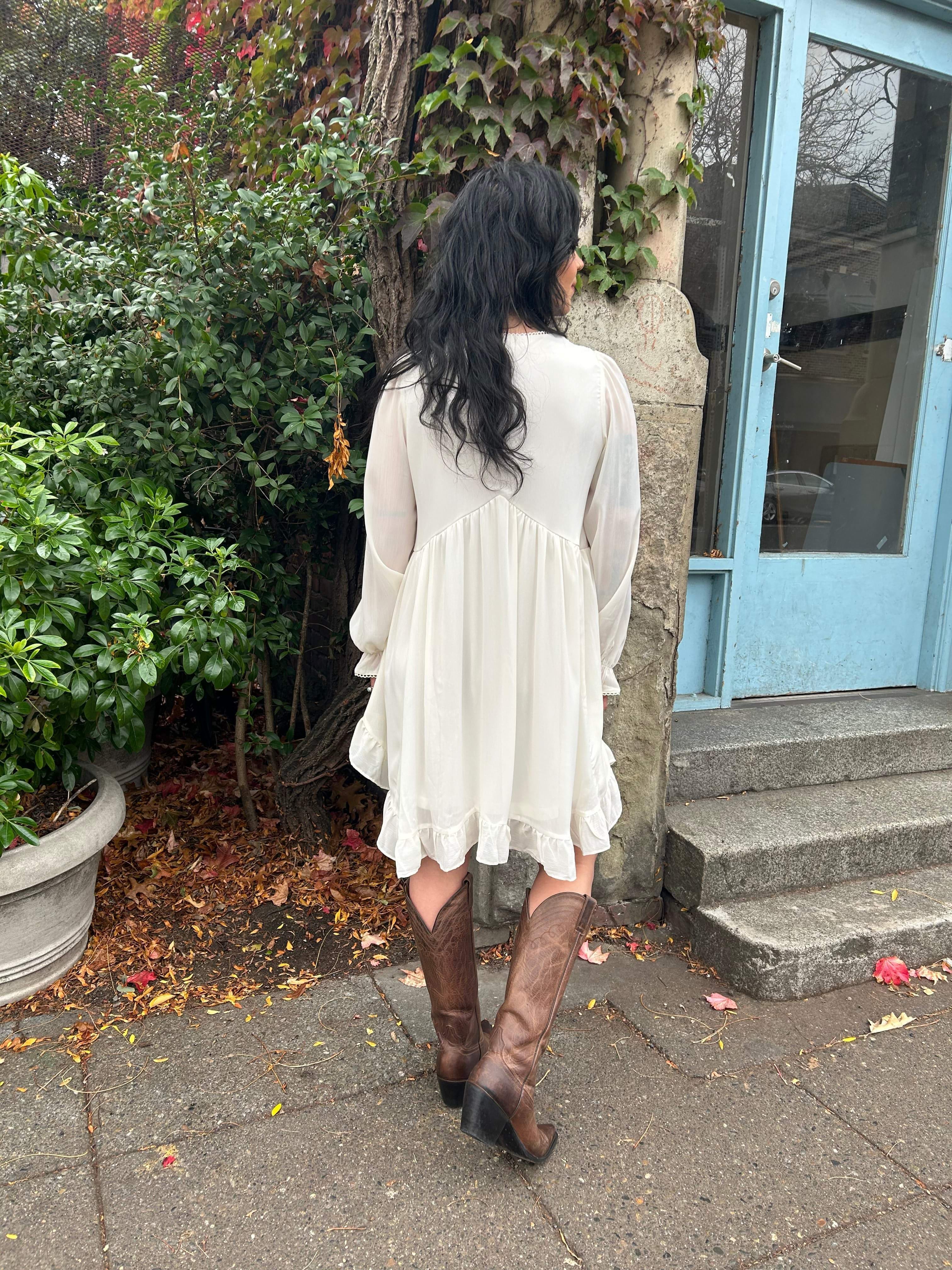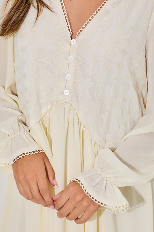 Our You're The One lace-embroidered cream dress is perfect transitional piece between seasons. Sweet scallop details line the hem of the v-neck and long sleeves.