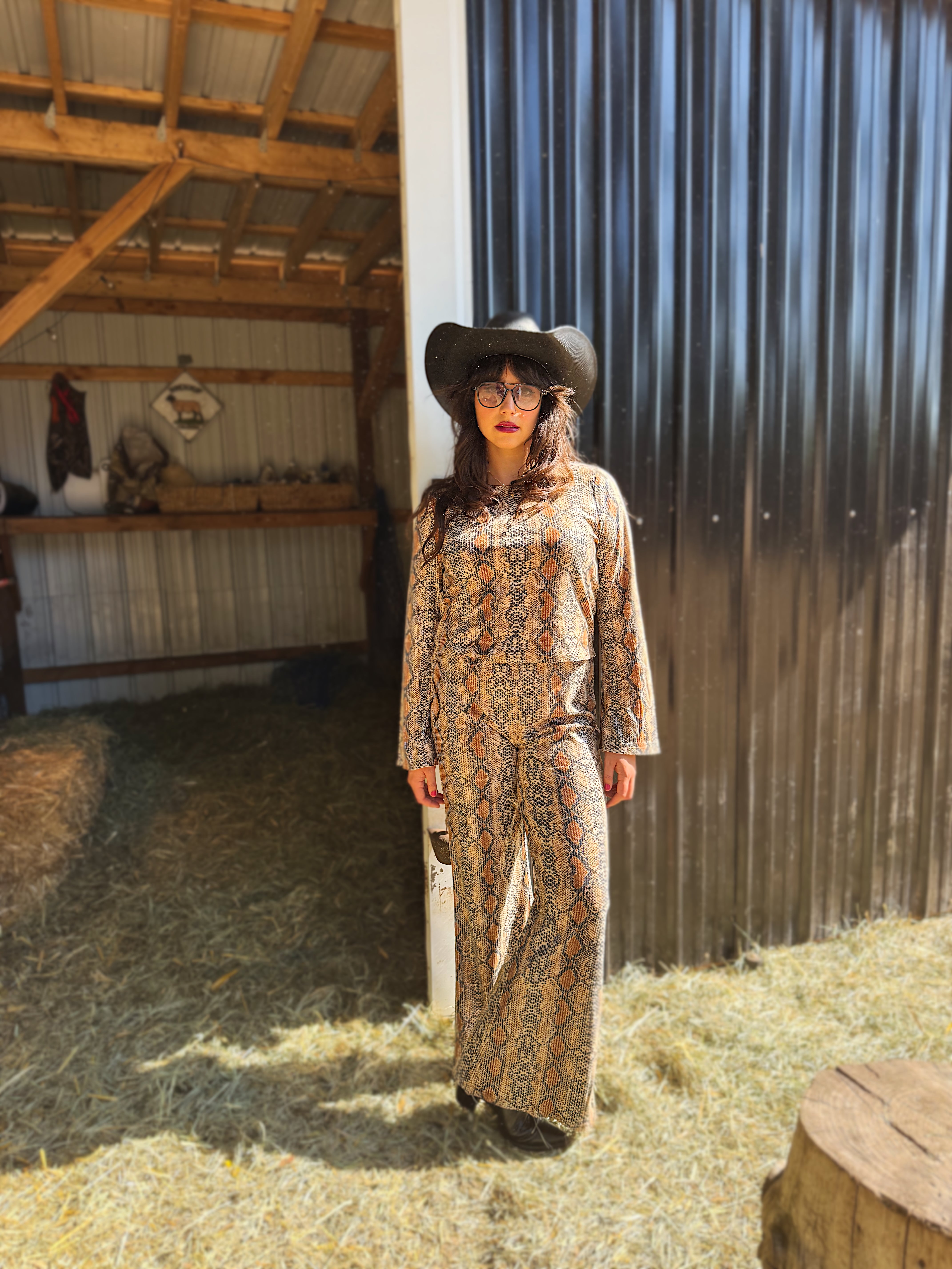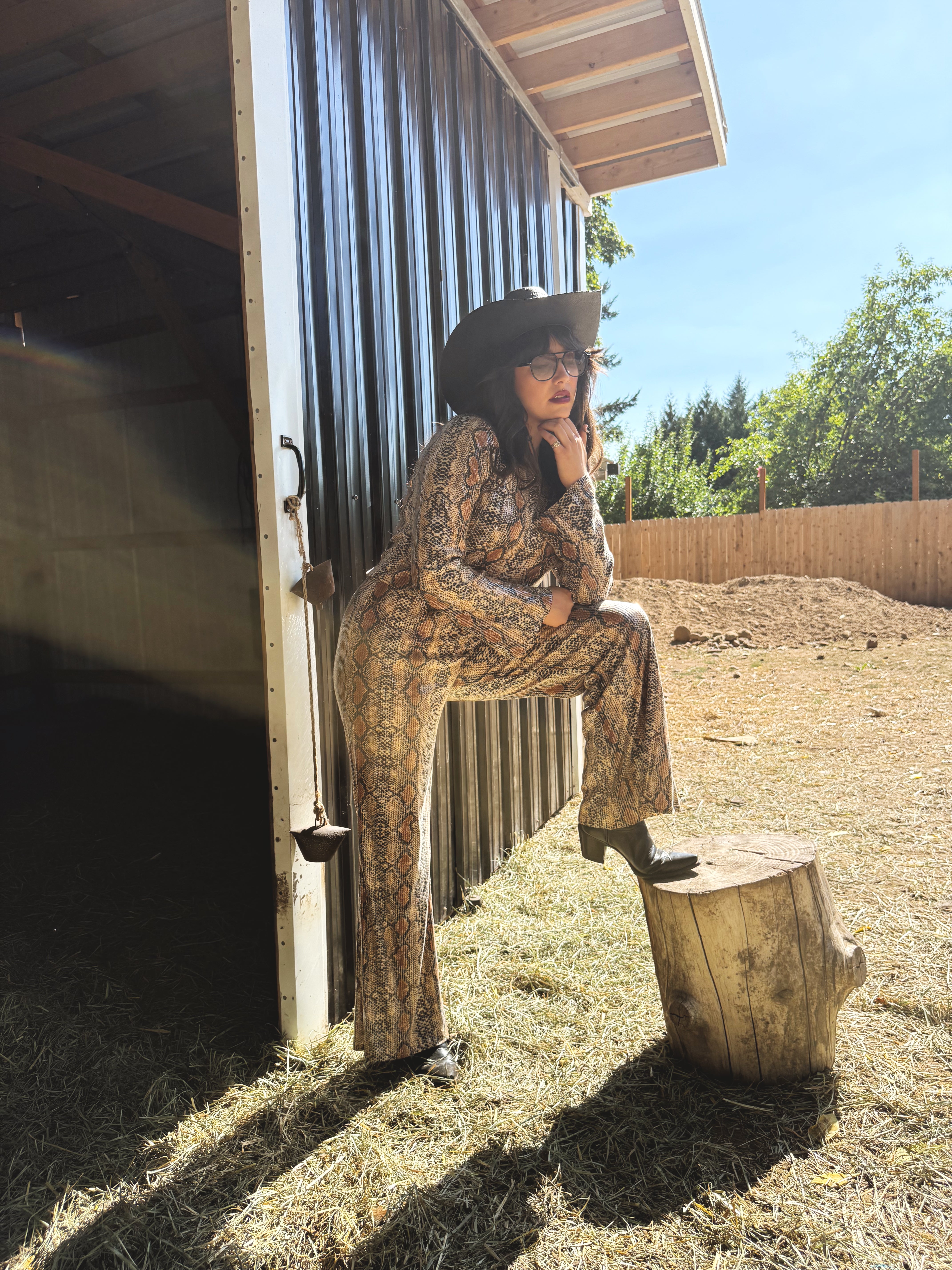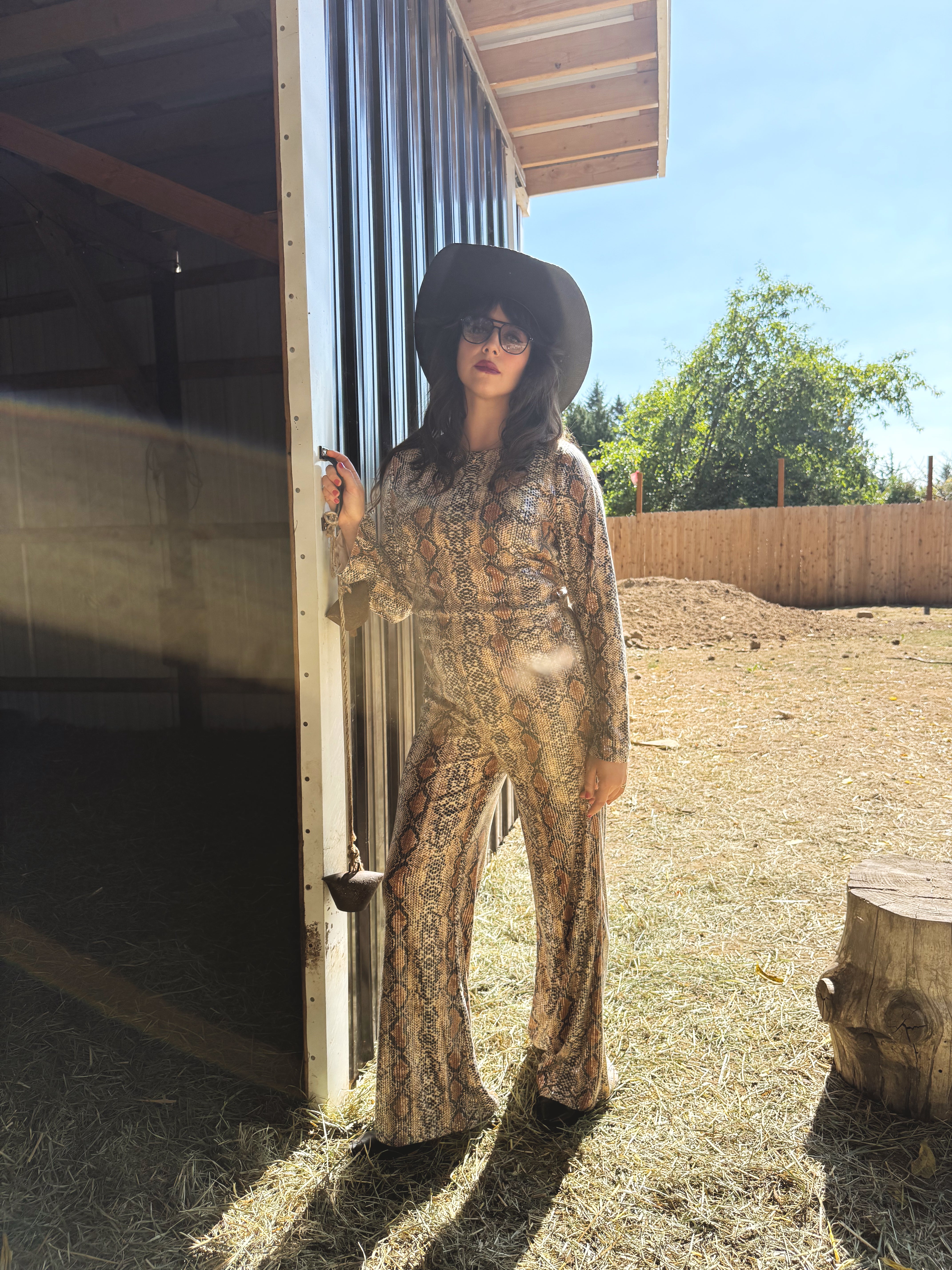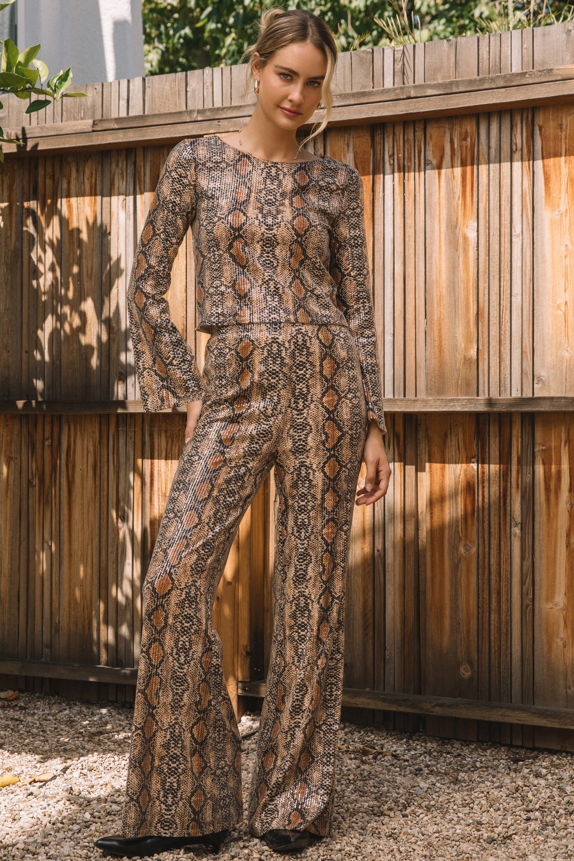 Our Bonnie Sequin Python top is the perfect pair to our Bonnie sequin bell bottoms. Add the edge you needed to your wardrobe. Stand out with this top on its own or grab the set. No one will forget you.