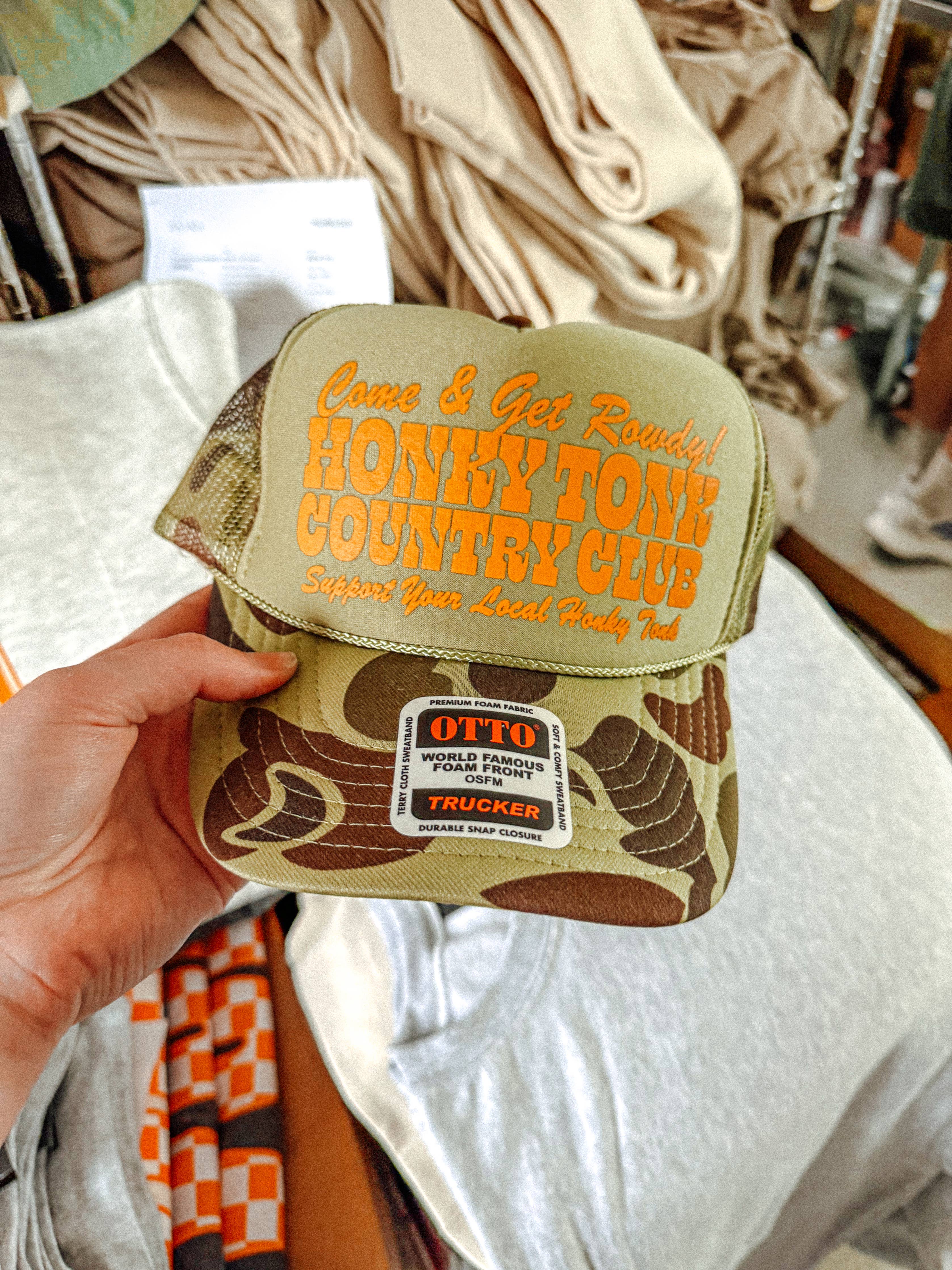 Come join us at the Honky Tonk in our Honky Tonk Country Club trucker hat. Features the phrase "Come and Get Rowdy! Honky Tonk Country Club" across the front in an orange ink. Comes with a removable pin attached