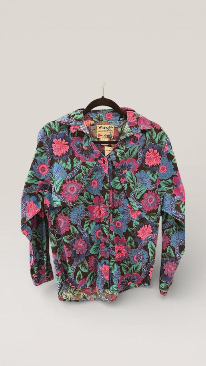 This unique Vintage Wrangler Western Button Up shirt is one of those Vintage finds that sticks with you forever. With a vibrant floral design, time did not fade this color one bit! This Vintage Wrangler measures to a true Men’s Small!